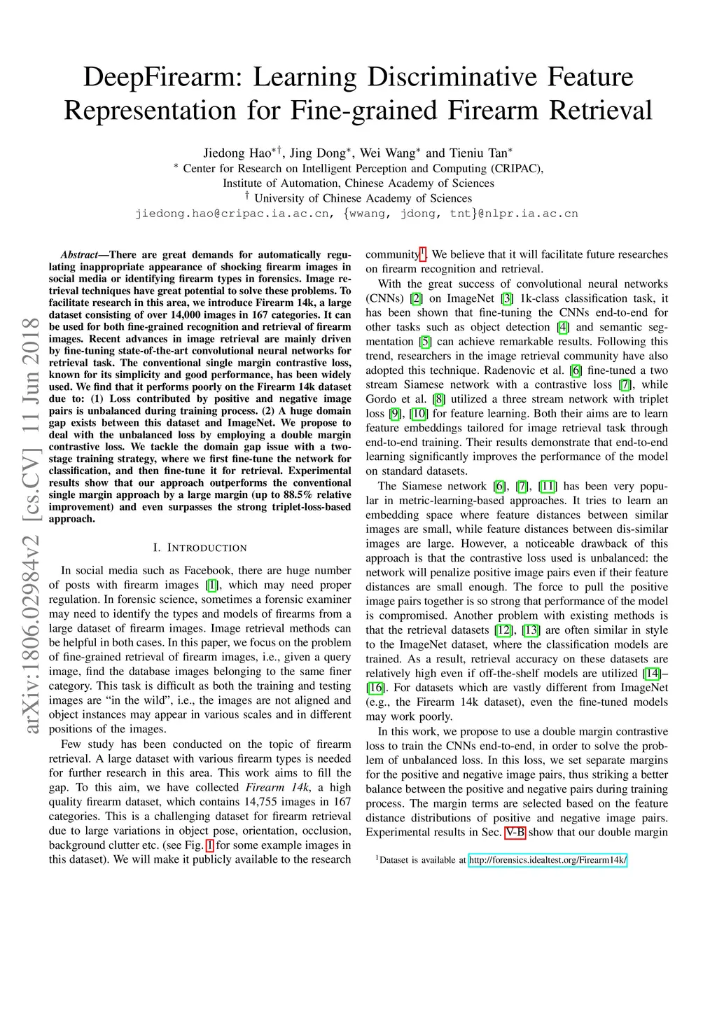 There are great demands for automatically regulating inappropriate appearance of shocking firearm images in social media or identifying firearm types in forensics. Image retrieval techniques have great potential to solve these problems. To facilitate research in this area, we introduce Firearm 14k, a large dataset consisting of over 14,000 images in 167 categories. It can be used for both fine-grained recognition and retrieval of firearm images. Recent advances in image retrieval are mainly driven by fine-tuning state-of-the-art convolutional neural networks for retrieval task. The conventional single margin contrastive loss, known for its simplicity and good performance, has been widely used. We find that it performs poorly on the Firearm 14k dataset due to: (1) Loss contributed by positive and negative image pairs is unbalanced during training process. (2) A huge domain gap exists between this dataset and ImageNet. We propose to deal with the unbalanced loss by employing a double margin contrastive loss. We tackle the domain gap issue with a two-stage training strategy, where we first fine-tune the network for classification, and then fine-tune it for retrieval. Experimental results show that our approach outperforms the conventional single margin approach by a large margin (up to 88.5% relative improvement) and even surpasses the strong triplet-loss-based approach.