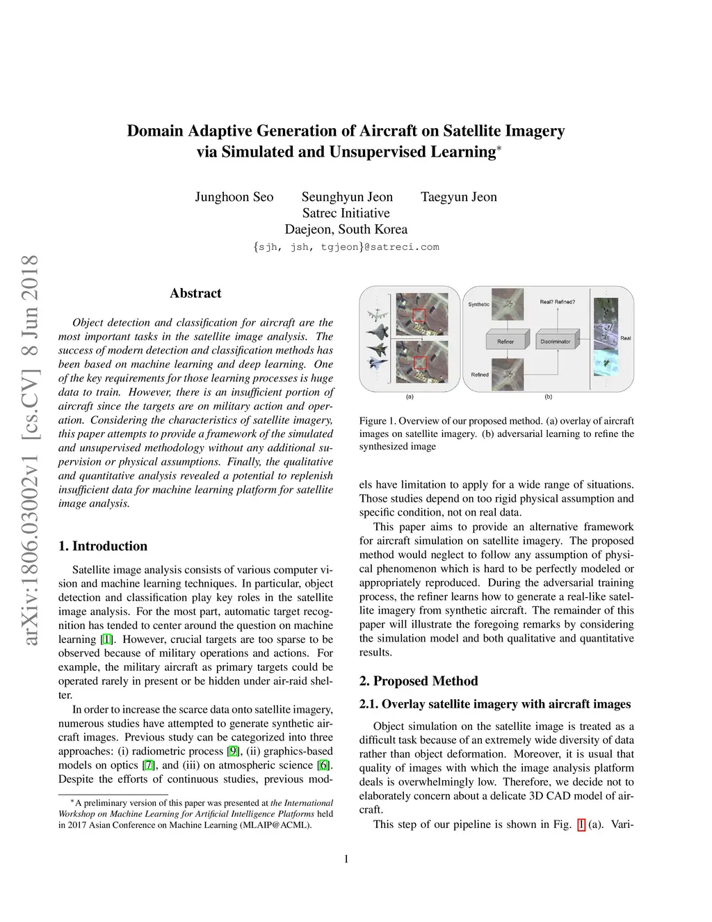Object detection and classification for aircraft are the most important tasks in the satellite image analysis. The success of modern detection and classification methods has been based on machine learning and deep learning. One of the key requirements for those learning processes is huge data to train. However, there is an insufficient portion of aircraft since the targets are on military action and oper- ation. Considering the characteristics of satellite imagery, this paper attempts to provide a framework of the simulated and unsupervised methodology without any additional su- pervision or physical assumptions. Finally, the qualitative and quantitative analysis revealed a potential to replenish insufficient data for machine learning platform for satellite image analysis.