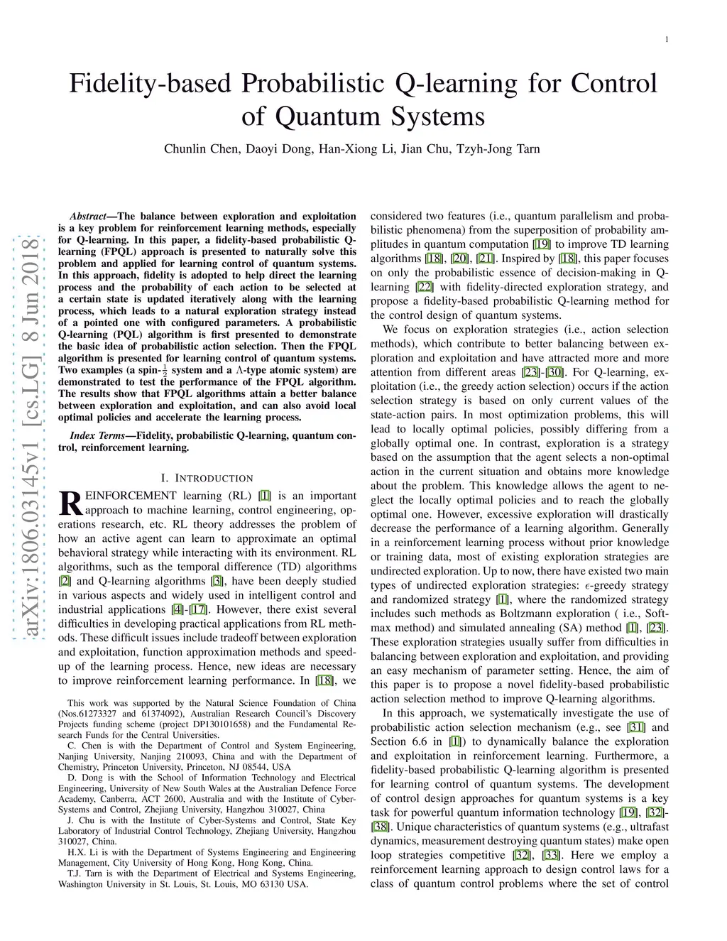 Fidelity-based Probabilistic Q-learning for Control of Quantum Systems