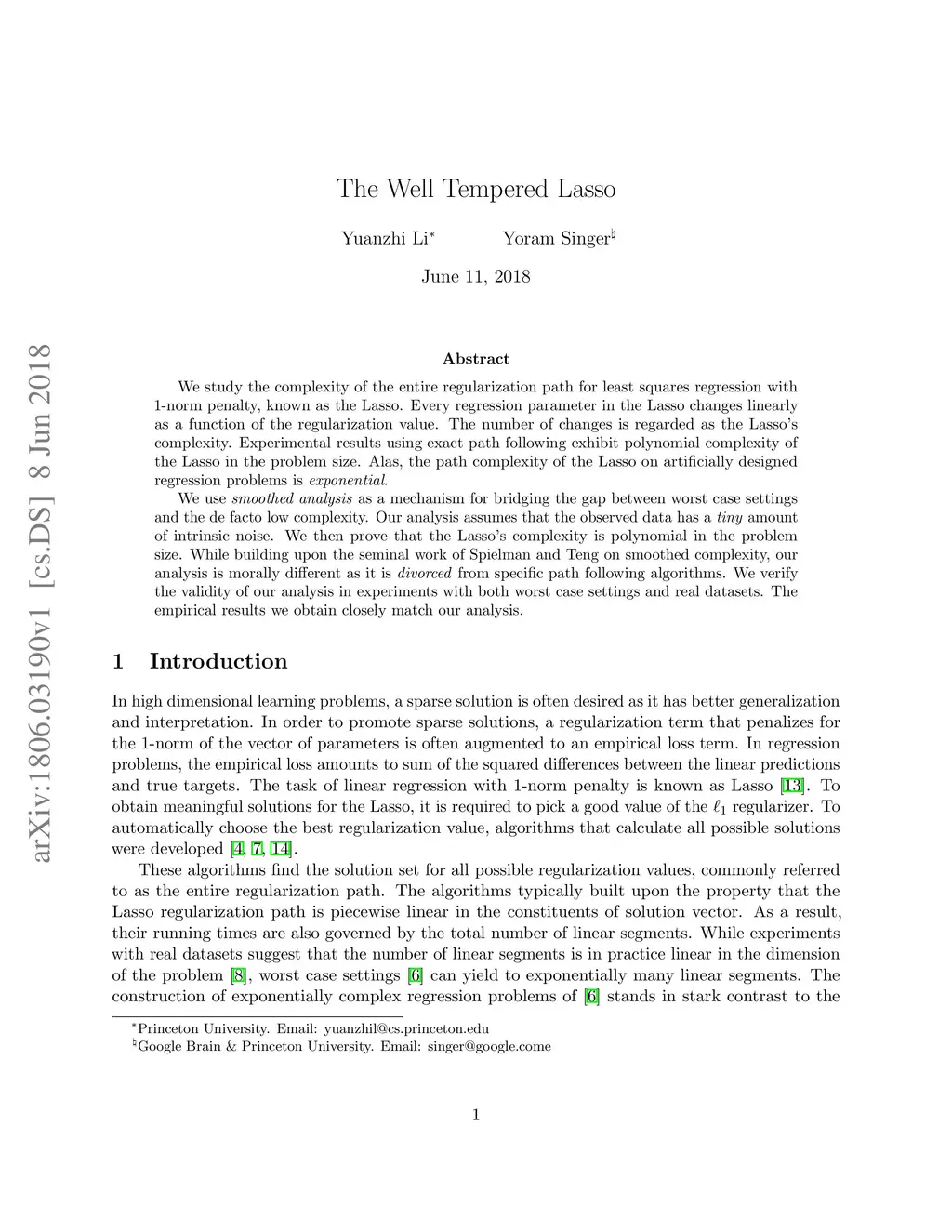 We study the complexity of the entire regularization path for least squares regression with 1-norm penalty, known as the Lasso. Every regression parameter in the Lasso changes linearly as a function of the regularization value. The number of changes is regarded as the Lasso's complexity. Experimental results using exact path following exhibit polynomial complexity of the Lasso in the problem size. Alas, the path complexity of the Lasso on artificially designed regression problems is exponential. We use smoothed analysis as a mechanism for bridging the gap between worst case settings and the de facto low complexity. Our analysis assumes that the observed data has a tiny amount of intrinsic noise. We then prove that the Lasso's complexity is polynomial in the problem size. While building upon the seminal work of Spielman and Teng on smoothed complexity, our analysis is morally different as it is divorced from specific path following algorithms. We verify the validity of our analysis in experiments with both worst case settings and real datasets. The empirical results we obtain closely match our analysis.