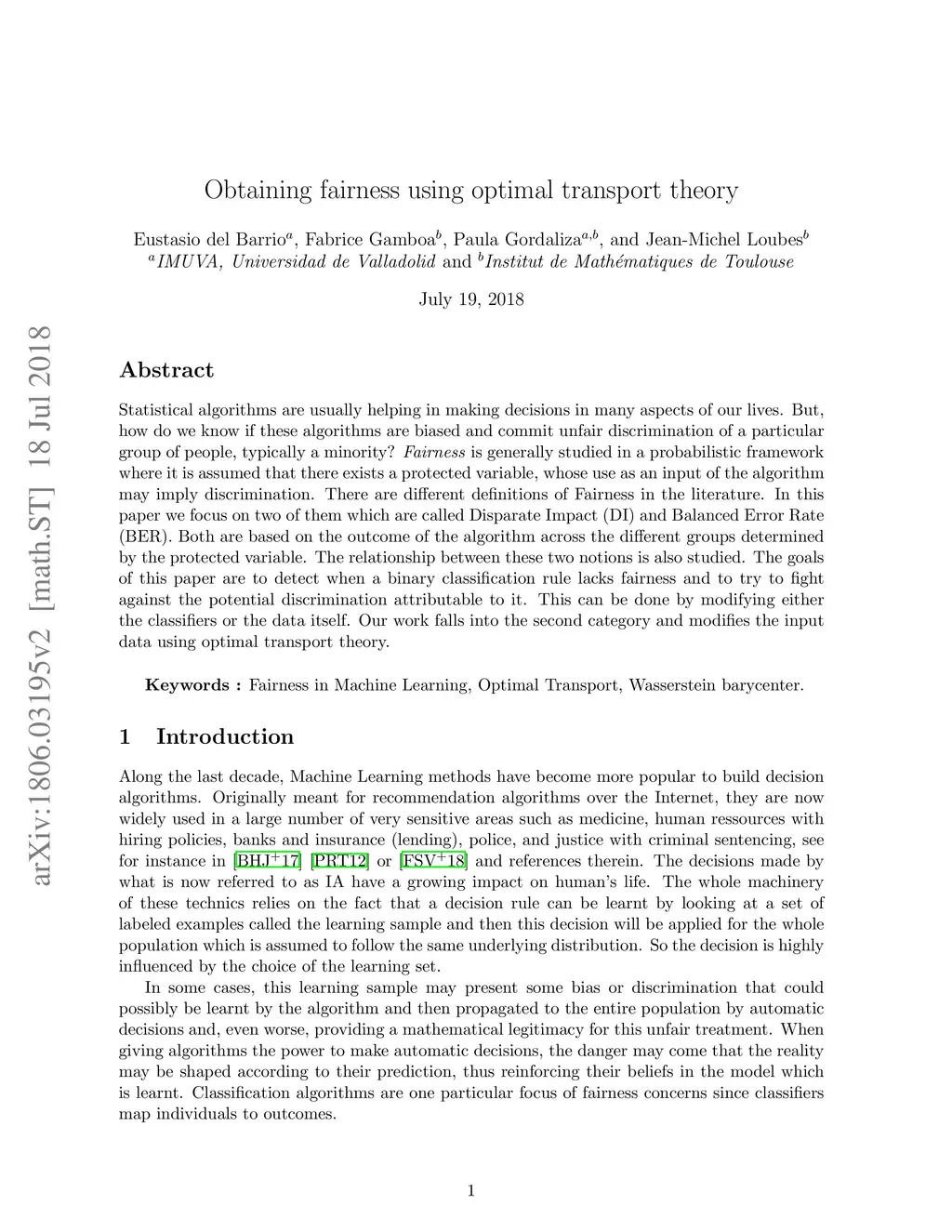 Statistical algorithms are usually helping in making decisions in many aspects of our lives. But, how do we know if these algorithms are biased and commit unfair discrimination of a particular group of people, typically a minority? \textit{Fairness} is generally studied in a probabilistic framework where it is assumed that there exists a protected variable, whose use as an input of the algorithm may imply discrimination. There are different definitions of Fairness in the literature. In this paper we focus on two of them which are called Disparate Impact (DI) and Balanced Error Rate (BER). Both are based on the outcome of the algorithm across the different groups determined by the protected variable. The relationship between these two notions is also studied. The goals of this paper are to detect when a binary classification rule lacks fairness and to try to fight against the potential discrimination attributable to it. This can be done by modifying either the classifiers or the data itself. Our work falls into the second category and modifies the input data using optimal transport theory.