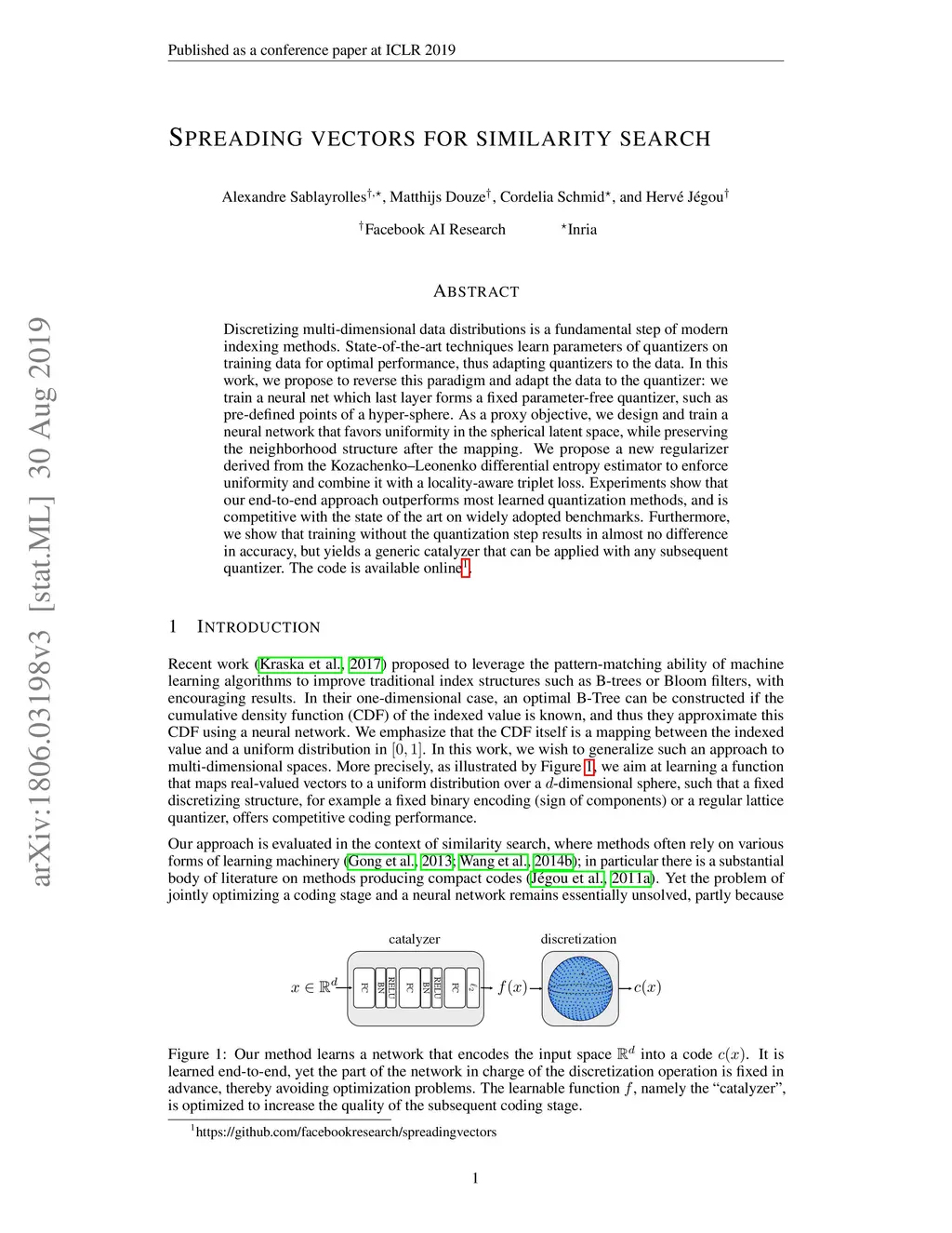 Discretizing multi-dimensional data distributions is a fundamental step of modern indexing methods. State-of-the-art techniques learn parameters of quantizers on training data for optimal performance, thus adapting quantizers to the data. In this work, we propose to reverse this paradigm and adapt the data to the quantizer: we train a neural net which last layer forms a fixed parameter-free quantizer, such as pre-defined points of a hyper-sphere. As a proxy objective, we design and train a neural network that favors uniformity in the spherical latent space, while preserving the neighborhood structure after the mapping. We propose a new regularizer derived from the Kozachenko--Leonenko differential entropy estimator to enforce uniformity and combine it with a locality-aware triplet loss. Experiments show that our end-to-end approach outperforms most learned quantization methods, and is competitive with the state of the art on widely adopted benchmarks. Furthermore, we show that training without the quantization step results in almost no difference in accuracy, but yields a generic catalyzer that can be applied with any subsequent quantizer.