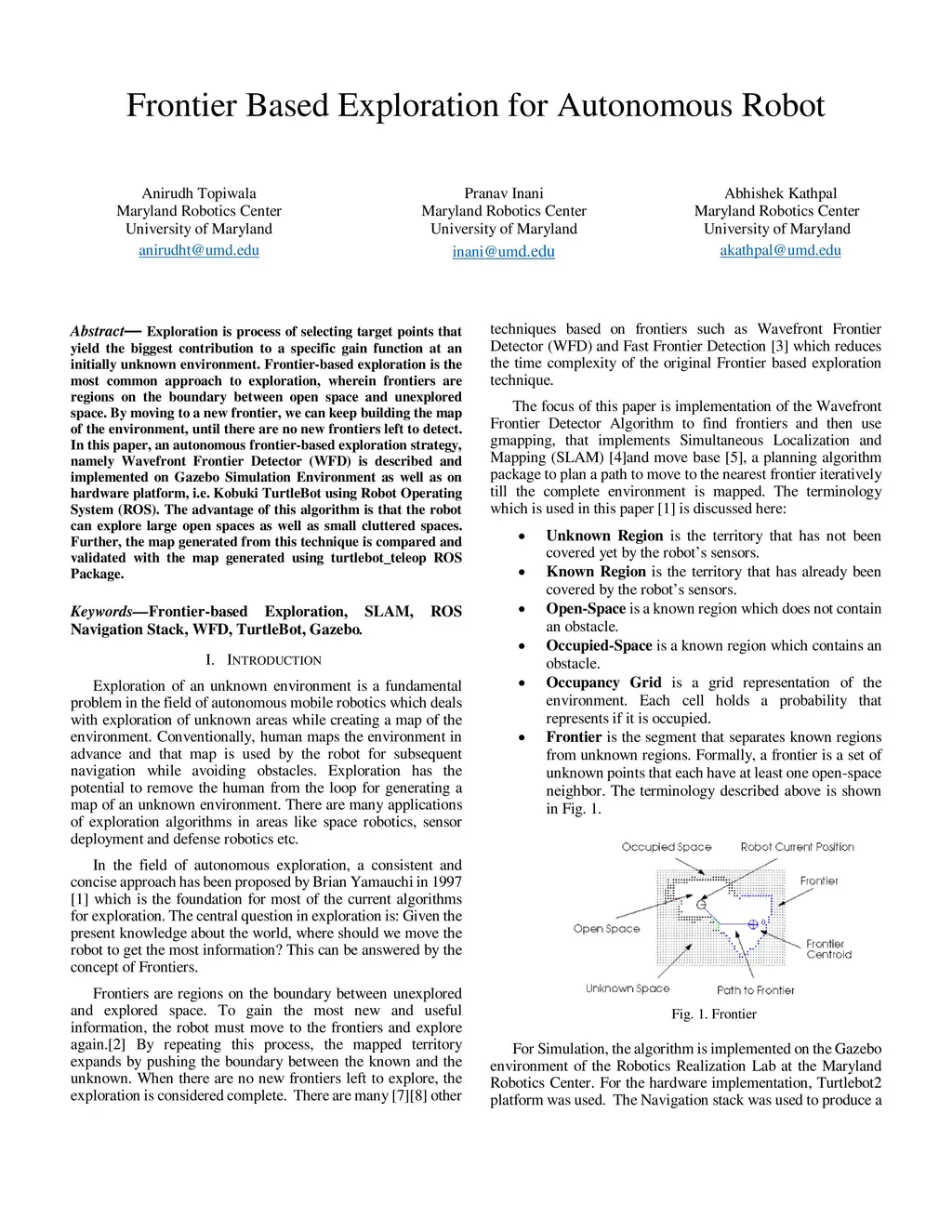Exploration is process of selecting target points that yield the biggest contribution to a specific gain function at an initially unknown environment. Frontier-based exploration is the most common approach to exploration, wherein frontiers are regions on the boundary between open space and unexplored space. By moving to a new frontier, we can keep building the map of the environment, until there are no new frontiers left to detect. In this paper, an autonomous frontier-based exploration strategy, namely Wavefront Frontier Detector (WFD) is described and implemented on Gazebo Simulation Environment as well as on hardware platform, i.e. Kobuki TurtleBot using Robot Operating System (ROS). The advantage of this algorithm is that the robot can explore large open spaces as well as small cluttered spaces. Further, the map generated from this technique is compared and validated with the map generated using turtlebot_teleop ROS Package.