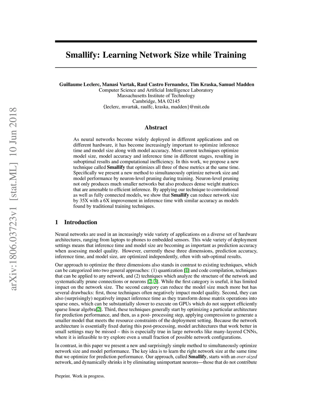 As neural networks become widely deployed in different applications and on different hardware, it has become increasingly important to optimize inference time and model size along with model accuracy. Most current techniques optimize model size, model accuracy and inference time in different stages, resulting in suboptimal results and computational inefficiency. In this work, we propose a new technique called Smallify that optimizes all three of these metrics at the same time. Specifically we present a new method to simultaneously optimize network size and model performance by neuron-level pruning during training. Neuron-level pruning not only produces much smaller networks but also produces dense weight matrices that are amenable to efficient inference. By applying our technique to convolutional as well as fully connected models, we show that Smallify can reduce network size by 35X with a 6X improvement in inference time with similar accuracy as models found by traditional training techniques.