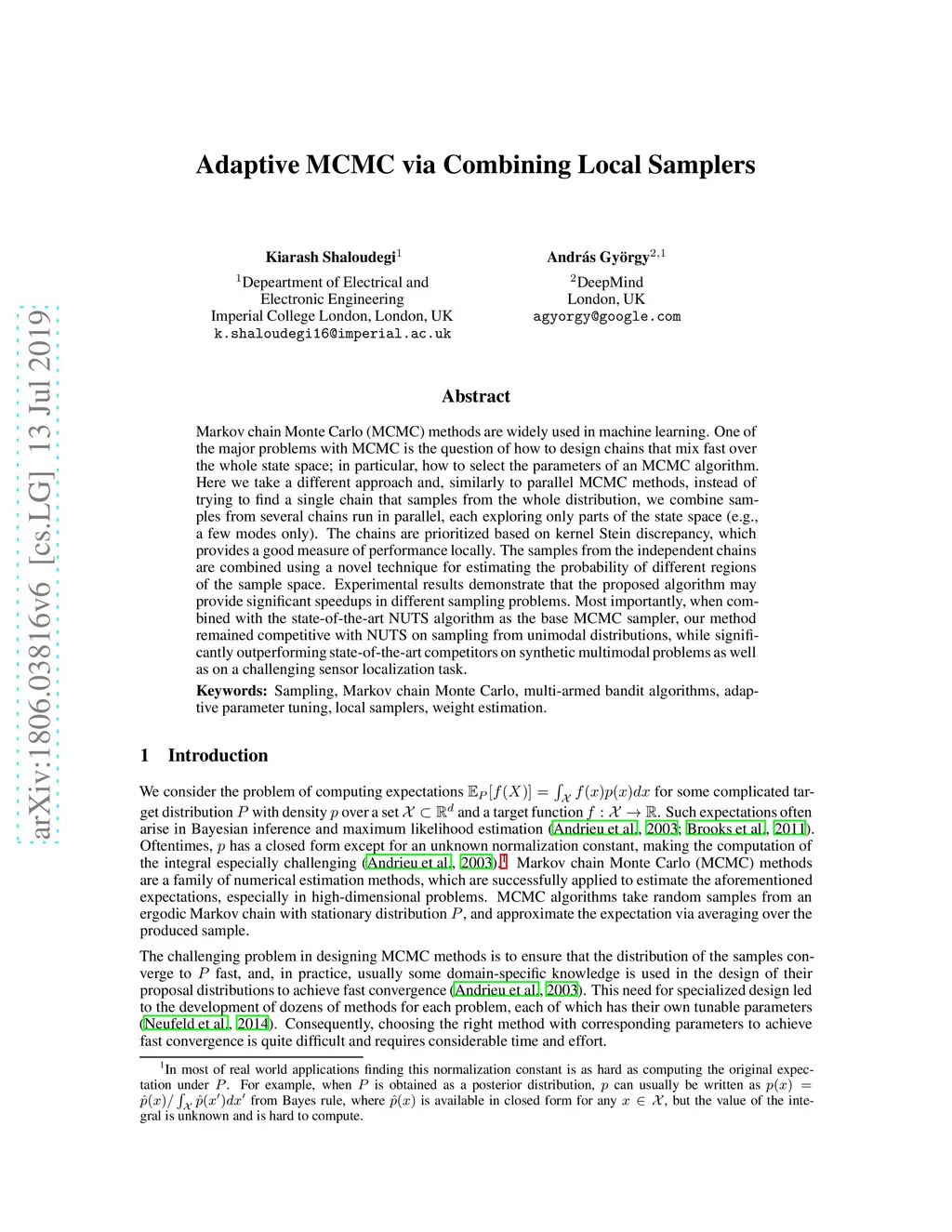 Markov chain Monte Carlo (MCMC) methods are widely used in machine learning. One of the major problems with MCMC is the question of how to design chains that mix fast over the whole state space; in particular, how to select the parameters of an MCMC algorithm. Here we take a different approach and, similarly to parallel MCMC methods, instead of trying to find a single chain that samples from the whole distribution, we combine samples from several chains run in parallel, each exploring only parts of the state space (e.g., a few modes only). The chains are prioritized based on kernel Stein discrepancy, which provides a good measure of performance locally. The samples from the independent chains are combined using a novel technique for estimating the probability of different regions of the sample space. Experimental results demonstrate that the proposed algorithm may provide significant speedups in different sampling problems. Most importantly, when combined with the state-of-the-art NUTS algorithm as the base MCMC sampler, our method remained competitive with NUTS on sampling from unimodal distributions, while significantly outperforming state-of-the-art competitors on synthetic multimodal problems as well as on a challenging sensor localization task.