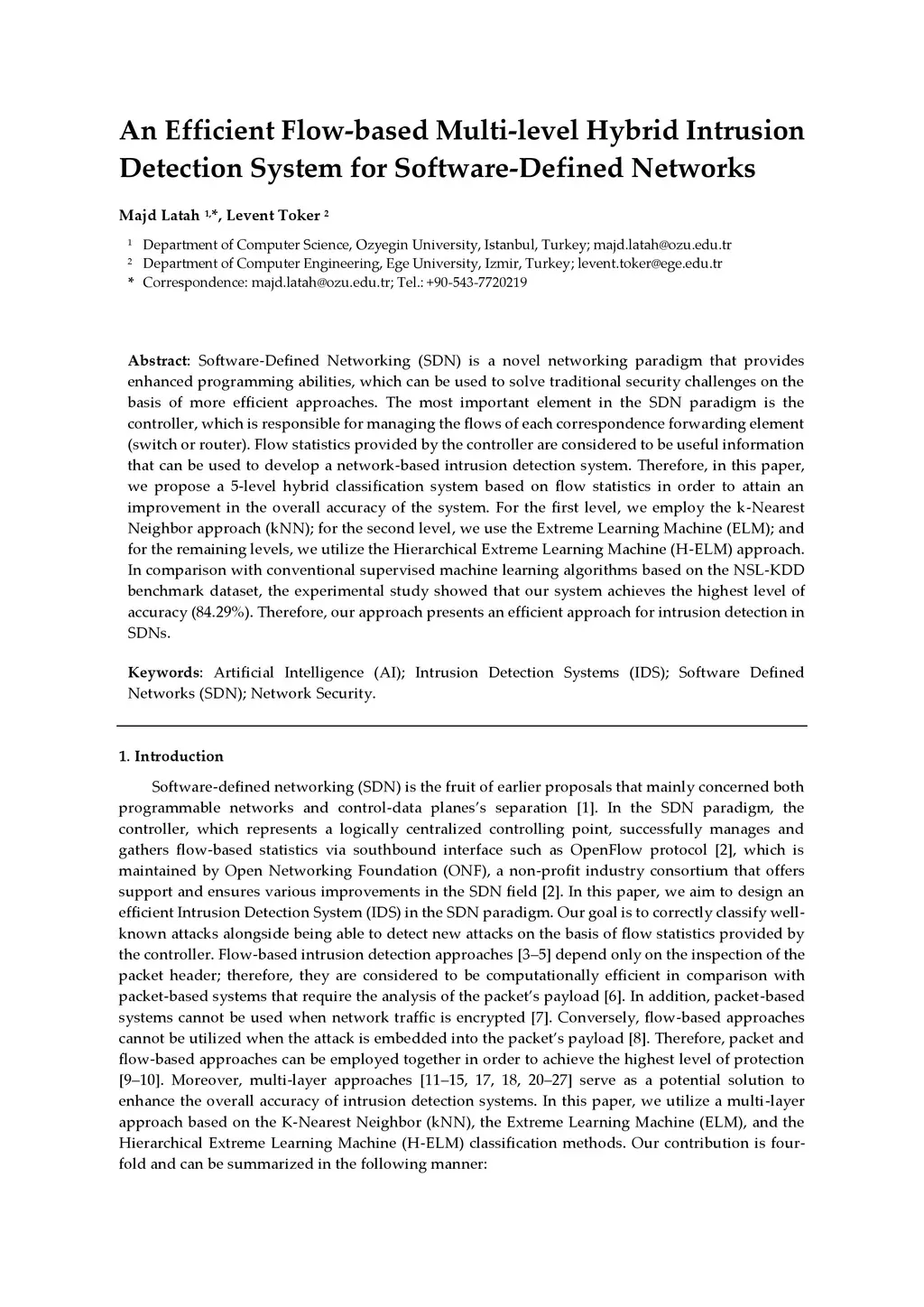 Software-Defined Networking (SDN) is a novel networking paradigm that provides enhanced programming abilities, which can be used to solve traditional security challenges on the basis of more efficient approaches. The most important element in the SDN paradigm is the controller, which is responsible for managing the flows of each correspondence forwarding element (switch or router). Flow statistics provided by the controller are considered to be useful information that can be used to develop a network-based intrusion detection system. Therefore, in this paper, we propose a 5-level hybrid classification system based on flow statistics in order to attain an improvement in the overall accuracy of the system. For the first level, we employ the k-Nearest Neighbor approach (kNN); for the second level, we use the Extreme Learning Machine (ELM); and for the remaining levels, we utilize the Hierarchical Extreme Learning Machine (H-ELM) approach. In comparison with conventional supervised machine learning algorithms based on the NSL-KDD benchmark dataset, the experimental study showed that our system achieves the highest level of accuracy (84.29%). Therefore, our approach presents an efficient approach for intrusion detection in SDNs.