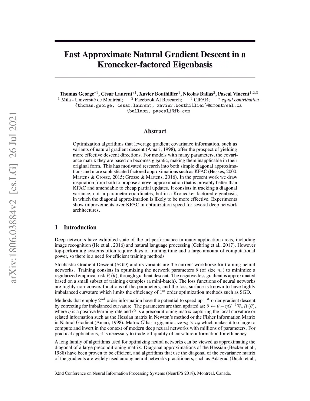 Optimization algorithms that leverage gradient covariance information, such as variants of natural gradient descent (Amari, 1998), offer the prospect of yielding more effective descent directions. For models with many parameters, the covariance matrix they are based on becomes gigantic, making them inapplicable in their original form. This has motivated research into both simple diagonal approximations and more sophisticated factored approximations such as KFAC (Heskes, 2000; Martens & Grosse, 2015; Grosse & Martens, 2016). In the present work we draw inspiration from both to propose a novel approximation that is provably better than KFAC and amendable to cheap partial updates. It consists in tracking a diagonal variance, not in parameter coordinates, but in a Kronecker-factored eigenbasis, in which the diagonal approximation is likely to be more effective. Experiments show improvements over KFAC in optimization speed for several deep network architectures.