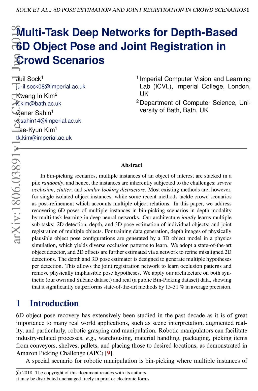 In bin-picking scenarios, multiple instances of an object of interest are stacked in a pile randomly, and hence, the instances are inherently subjected to the challenges: severe occlusion, clutter, and similar-looking distractors. Most existing methods are, however, for single isolated object instances, while some recent methods tackle crowd scenarios as post-refinement which accounts multiple object relations. In this paper, we address recovering 6D poses of multiple instances in bin-picking scenarios in depth modality by multi-task learning in deep neural networks. Our architecture jointly learns multiple sub-tasks: 2D detection, depth, and 3D pose estimation of individual objects; and joint registration of multiple objects. For training data generation, depth images of physically plausible object pose configurations are generated by a 3D object model in a physics simulation, which yields diverse occlusion patterns to learn. We adopt a state-of-the-art object detector, and 2D offsets are further estimated via a network to refine misaligned 2D detections. The depth and 3D pose estimator is designed to generate multiple hypotheses per detection. This allows the joint registration network to learn occlusion patterns and remove physically implausible pose hypotheses. We apply our architecture on both synthetic (our own and Sileane dataset) and real (a public Bin-Picking dataset) data, showing that it significantly outperforms state-of-the-art methods by 15-31% in average precision.
