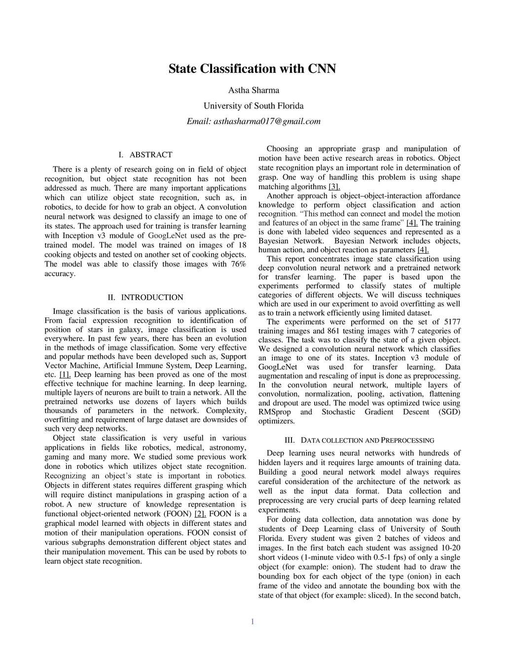 There is a plenty of research going on in field of object recognition, but object state recognition has not been addressed as much. There are many important applications which can utilize object state recognition, such as, in robotics, to decide for how to grab an object. A convolution neural network was designed to classify an image to one of its states. The approach used for training is transfer learning with Inception v3 module of GoogLeNet used as the pre-trained model. The model was trained on images of 18 cooking objects and tested on another set of cooking objects. The model was able to classify those images with 76% accuracy.