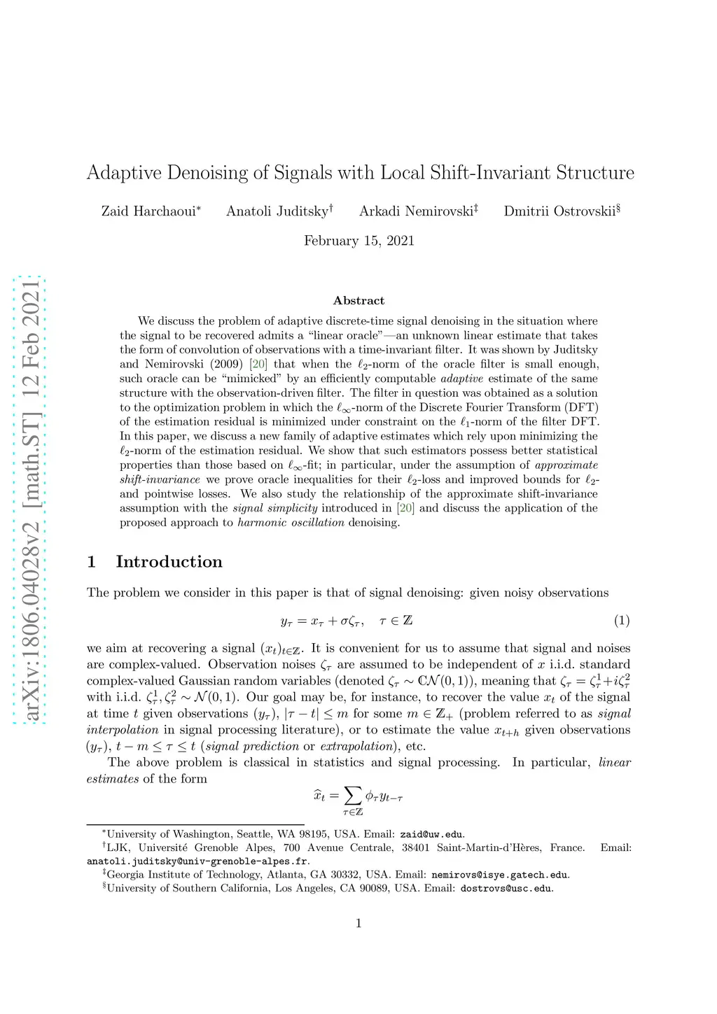 We discuss the problem of adaptive discrete-time signal denoising in the situation where the signal to be recovered admits a "linear oracle" -- an unknown linear estimate that takes the form of convolution of observations with a time-invariant filter. It was shown by Juditsky and Nemirovski (2009) that when the -norm of the oracle filter is small enough, such oracle can be "mimicked" by an efficiently computable adaptive estimate of the same structure with an observation-driven filter. The filter in question was obtained as a solution to the optimization problem in which the -norm of the Discrete Fourier Transform (DFT) of the estimation residual is minimized under constraint on the -norm of the filter DFT. In this paper, we discuss a new family of adaptive estimates which rely upon minimizing the -norm of the estimation residual. We show that such estimators possess better statistical properties than those based on -fit; in particular, we prove oracle inequalities for their -loss and improved bounds for - and pointwise losses. The oracle inequalities rely on the "approximate shift-invariance" assumption stating that the signal to be recovered is close to an (unknown) shift-invariant subspace. We also study the relationship of the approximate shift-invariance assumption with the "signal simplicity" assumption introduced in Juditsky and Nemirovski (2009) and discuss the application of the proposed approach to harmonic oscillations denoising.