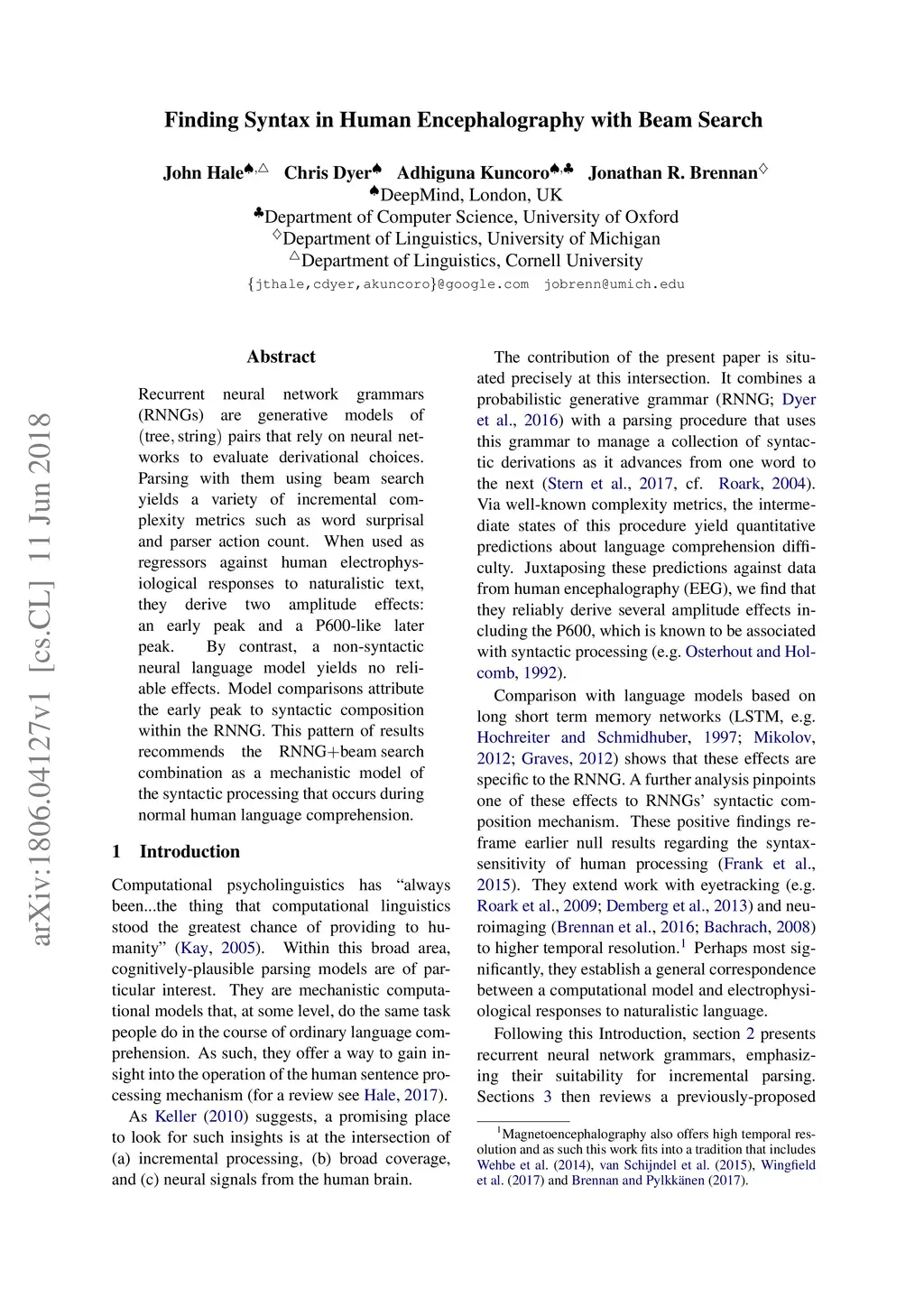 Recurrent neural network grammars (RNNGs) are generative models of (tree,string) pairs that rely on neural networks to evaluate derivational choices. Parsing with them using beam search yields a variety of incremental complexity metrics such as word surprisal and parser action count. When used as regressors against human electrophysiological responses to naturalistic text, they derive two amplitude effects: an early peak and a P600-like later peak. By contrast, a non-syntactic neural language model yields no reliable effects. Model comparisons attribute the early peak to syntactic composition within the RNNG. This pattern of results recommends the RNNG+beam search combination as a mechanistic model of the syntactic processing that occurs during normal human language comprehension.