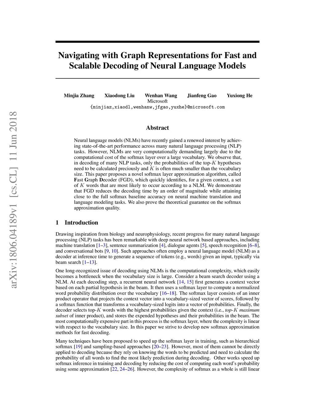 Neural language models (NLMs) have recently gained a renewed interest by achieving state-of-the-art performance across many natural language processing (NLP) tasks. However, NLMs are very computationally demanding largely due to the computational cost of the softmax layer over a large vocabulary. We observe that, in decoding of many NLP tasks, only the probabilities of the top-K hypotheses need to be calculated preciously and K is often much smaller than the vocabulary size. This paper proposes a novel softmax layer approximation algorithm, called Fast Graph Decoder (FGD), which quickly identifies, for a given context, a set of K words that are most likely to occur according to a NLM. We demonstrate that FGD reduces the decoding time by an order of magnitude while attaining close to the full softmax baseline accuracy on neural machine translation and language modeling tasks. We also prove the theoretical guarantee on the softmax approximation quality.