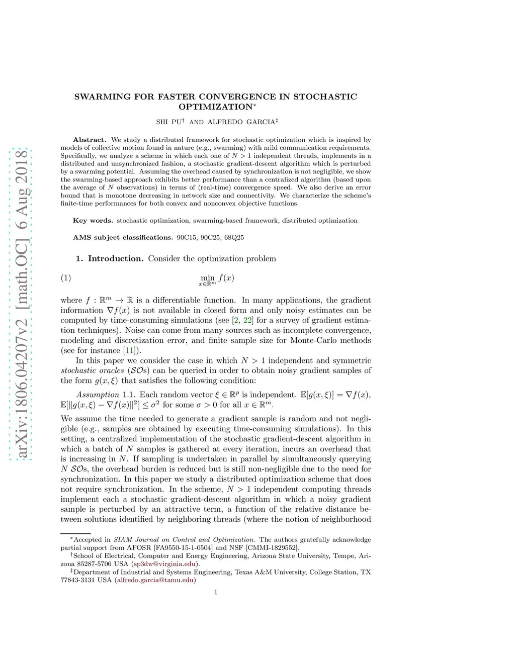 Swarming for Faster Convergence in Stochastic Optimization