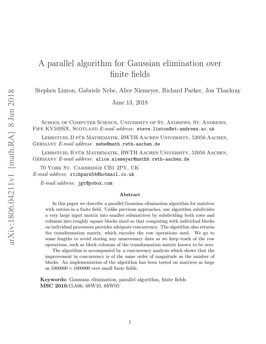 A parallel algorithm for Gaussian elimination over finite fields