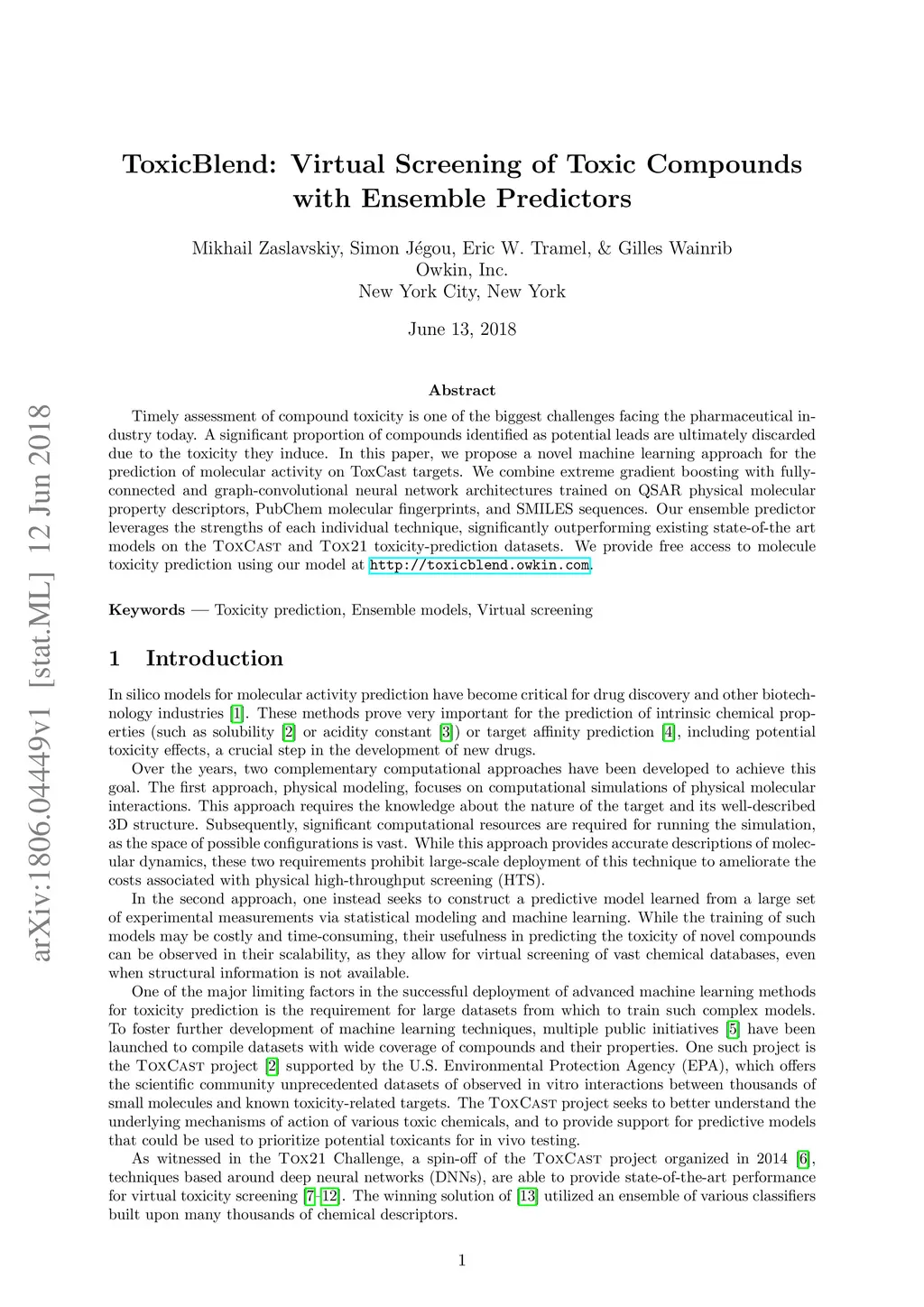 Timely assessment of compound toxicity is one of the biggest challenges facing the pharmaceutical industry today. A significant proportion of compounds identified as potential leads are ultimately discarded due to the toxicity they induce. In this paper, we propose a novel machine learning approach for the prediction of molecular activity on ToxCast targets. We combine extreme gradient boosting with fully-connected and graph-convolutional neural network architectures trained on QSAR physical molecular property descriptors, PubChem molecular fingerprints, and SMILES sequences. Our ensemble predictor leverages the strengths of each individual technique, significantly outperforming existing state-of-the art models on the ToxCast and Tox21 toxicity-prediction datasets. We provide free access to molecule toxicity prediction using our model at http://www.owkin.com/toxicblend.