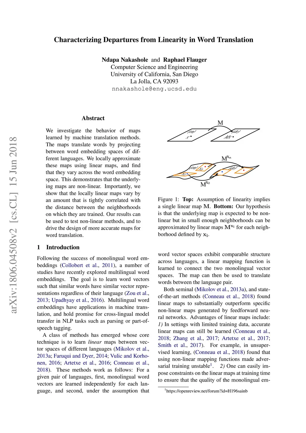 We investigate the behavior of maps learned by machine translation methods. The maps translate words by projecting between word embedding spaces of different languages. We locally approximate these maps using linear maps, and find that they vary across the word embedding space. This demonstrates that the underlying maps are non-linear. Importantly, we show that the locally linear maps vary by an amount that is tightly correlated with the distance between the neighborhoods on which they are trained. Our results can be used to test non-linear methods, and to drive the design of more accurate maps for word translation.