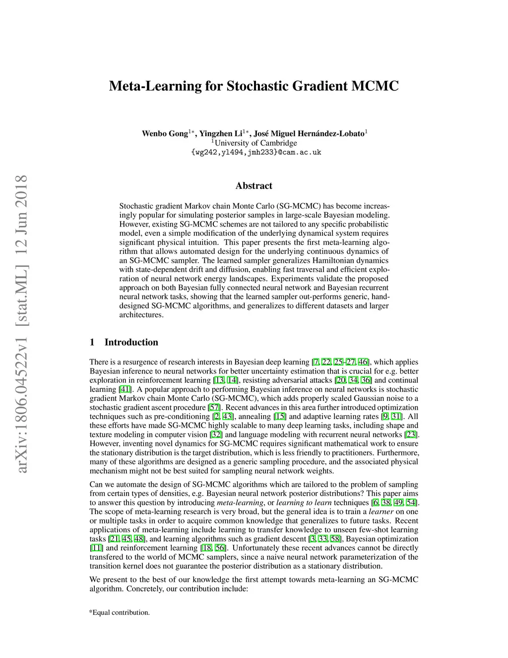Stochastic gradient Markov chain Monte Carlo (SG-MCMC) has become increasingly popular for simulating posterior samples in large-scale Bayesian modeling. However, existing SG-MCMC schemes are not tailored to any specific probabilistic model, even a simple modification of the underlying dynamical system requires significant physical intuition. This paper presents the first meta-learning algorithm that allows automated design for the underlying continuous dynamics of an SG-MCMC sampler. The learned sampler generalizes Hamiltonian dynamics with state-dependent drift and diffusion, enabling fast traversal and efficient exploration of neural network energy landscapes. Experiments validate the proposed approach on both Bayesian fully connected neural network and Bayesian recurrent neural network tasks, showing that the learned sampler out-performs generic, hand-designed SG-MCMC algorithms, and generalizes to different datasets and larger architectures.