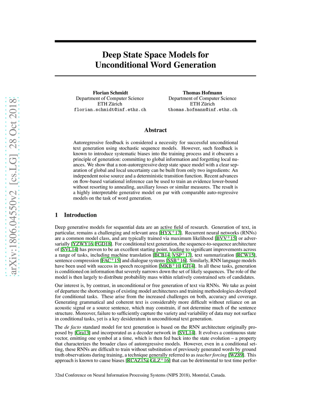 Autoregressive feedback is considered a necessity for successful unconditional text generation using stochastic sequence models. However, such feedback is known to introduce systematic biases into the training process and it obscures a principle of generation: committing to global information and forgetting local nuances. We show that a non-autoregressive deep state space model with a clear separation of global and local uncertainty can be built from only two ingredients: An independent noise source and a deterministic transition function. Recent advances on flow-based variational inference can be used to train an evidence lower-bound without resorting to annealing, auxiliary losses or similar measures. The result is a highly interpretable generative model on par with comparable auto-regressive models on the task of word generation.
