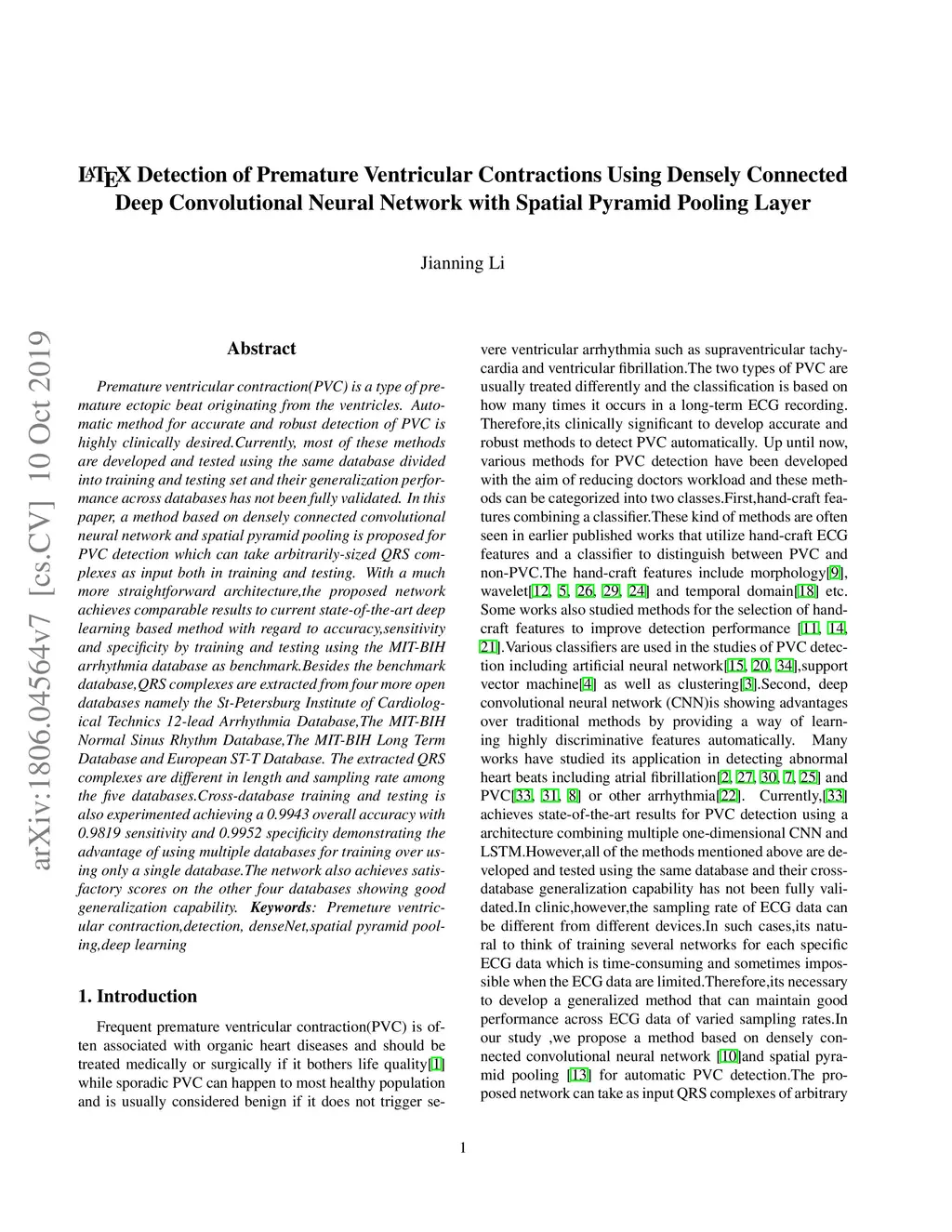 Premature ventricular contraction(PVC) is a type of premature ectopic beat originating from the ventricles. Automatic method for accurate and robust detection of PVC is highly clinically desired.Currently, most of these methods are developed and tested using the same database divided into training and testing set and their generalization performance across databases has not been fully validated. In this paper, a method based on densely connected convolutional neural network and spatial pyramid pooling is proposed for PVC detection which can take arbitrarily-sized QRS complexes as input both in training and testing. With a much less complicated and more straightforward architecture,the proposed network achieves comparable results to current state-of-the-art deep learning based method with regard to accuracy,sensitivity and specificity by training and testing using the MIT-BIH arrhythmia database as benchmark.Besides the benchmark database,QRS complexes are extracted from four more open databases namely the St-Petersburg Institute of Cardiological Technics 12-lead Arrhythmia Database,The MIT-BIH Normal Sinus Rhythm Database,The MIT-BIH Long Term Database and European ST-T Database. The extracted QRS complexes are different in length and sampling rate among the five databases.Cross-database training and testing is also experimented.The performance of the network shows an improvement on the benchmark database according to the result demonstrating the advantage of using multiple databases for training over using only a single database.The network also achieves satisfactory scores on the other four databases showing good generalization capability.