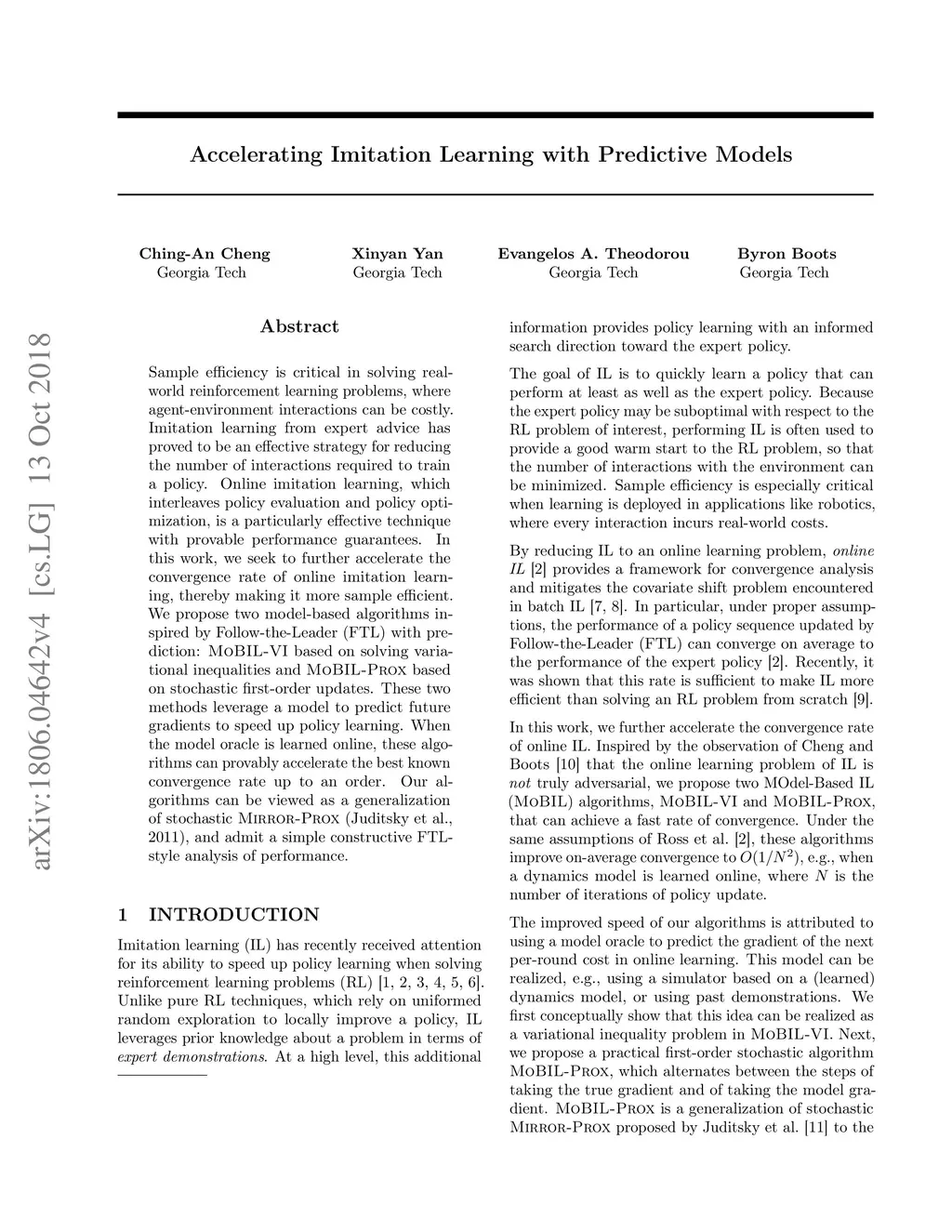 Sample efficiency is critical in solving real-world reinforcement learning problems, where agent-environment interactions can be costly. Imitation learning from expert advice has proved to be an effective strategy for reducing the number of interactions required to train a policy. Online imitation learning, which interleaves policy evaluation and policy optimization, is a particularly effective technique with provable performance guarantees. In this work, we seek to further accelerate the convergence rate of online imitation learning, thereby making it more sample efficient. We propose two model-based algorithms inspired by Follow-the-Leader (FTL) with prediction: MoBIL-VI based on solving variational inequalities and MoBIL-Prox based on stochastic first-order updates. These two methods leverage a model to predict future gradients to speed up policy learning. When the model oracle is learned online, these algorithms can provably accelerate the best known convergence rate up to an order. Our algorithms can be viewed as a generalization of stochastic Mirror-Prox (Juditsky et al., 2011), and admit a simple constructive FTL-style analysis of performance.