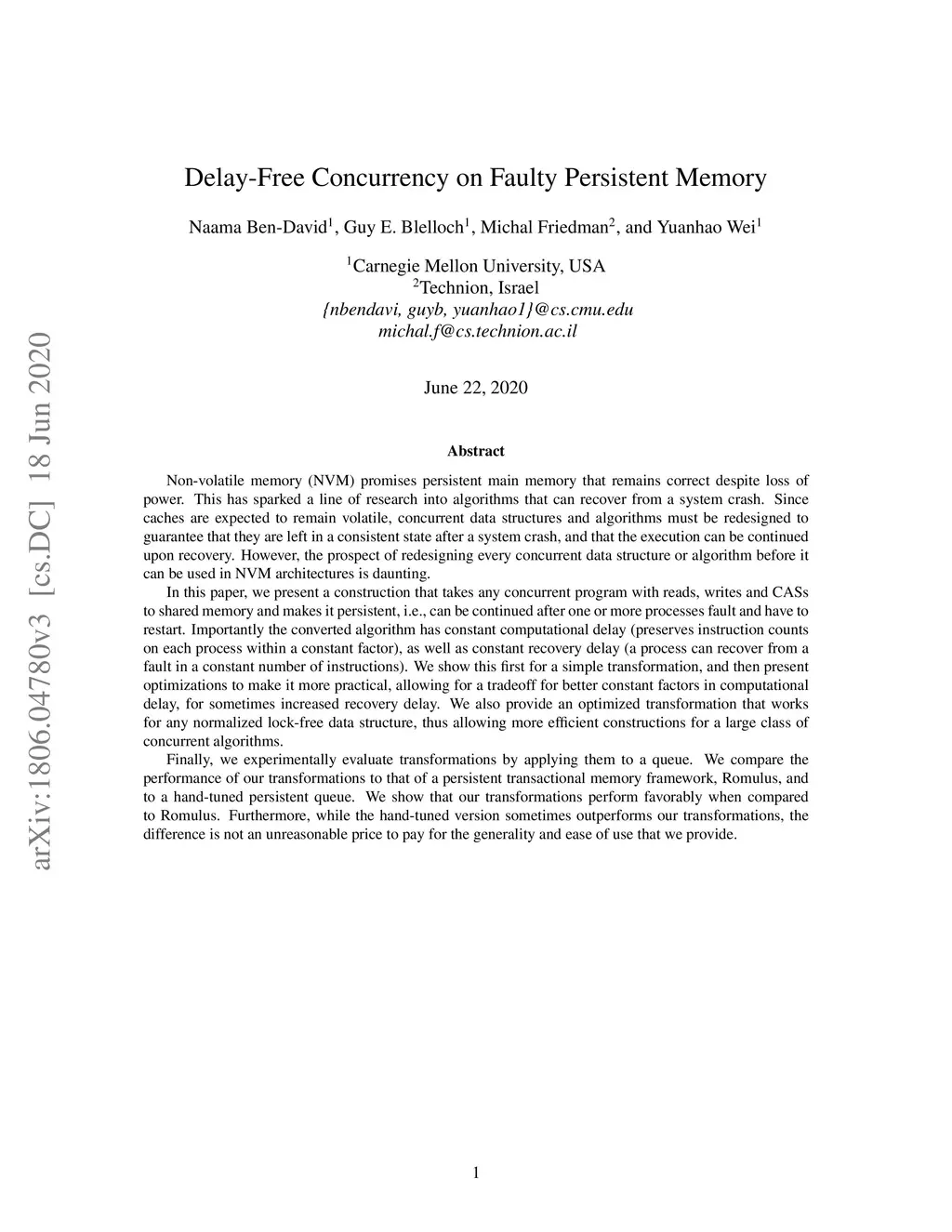Non-volatile memory (NVM) promises persistent main memory that remains correct despite loss of power. This has sparked a line of research into algorithms that can recover from a system crash. Since caches are expected to remain volatile, concurrent data structures and algorithms must be redesigned to guarantee that they are left in a consistent state after a system crash, and that the execution can be continued upon recovery. However, the prospect of redesigning every concurrent data structure or algorithm before it can be used in NVM architectures is daunting. In this paper, we present a construction that takes any concurrent program with reads, writes and CASs to shared memory and makes it persistent, i.e., can be continued after one or more processes fault and have to restart. Importantly the converted algorithm has constant computational delay (preserves instruction counts on each process within a constant factor), as well as constant recovery delay (a process can recover from a fault in a constant number of instructions). We show this first for a simple transformation, and then present optimizations to make it more practical, allowing for a tradeoff for better constant factors in computational delay, for sometimes increased recovery delay. We also provide an optimized transformation that works for any normalized lock-free data structure, thus allowing more efficient constructions for a large class of concurrent algorithms. We experimentally evaluate our transformations by applying them to a queue.