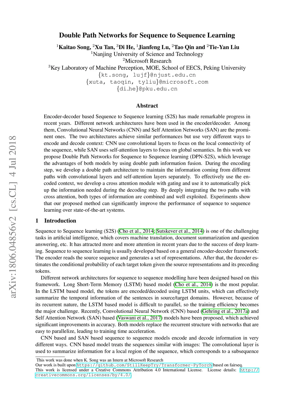 Encoder-decoder based Sequence to Sequence learning (S2S) has made remarkable progress in recent years. Different network architectures have been used in the encoder/decoder. Among them, Convolutional Neural Networks (CNN) and Self Attention Networks (SAN) are the prominent ones. The two architectures achieve similar performances but use very different ways to encode and decode context: CNN use convolutional layers to focus on the local connectivity of the sequence, while SAN uses self-attention layers to focus on global semantics. In this work we propose Double Path Networks for Sequence to Sequence learning (DPN-S2S), which leverage the advantages of both models by using double path information fusion. During the encoding step, we develop a double path architecture to maintain the information coming from different paths with convolutional layers and self-attention layers separately. To effectively use the encoded context, we develop a cross attention module with gating and use it to automatically pick up the information needed during the decoding step. By deeply integrating the two paths with cross attention, both types of information are combined and well exploited. Experiments show that our proposed method can significantly improve the performance of sequence to sequence learning over state-of-the-art systems.