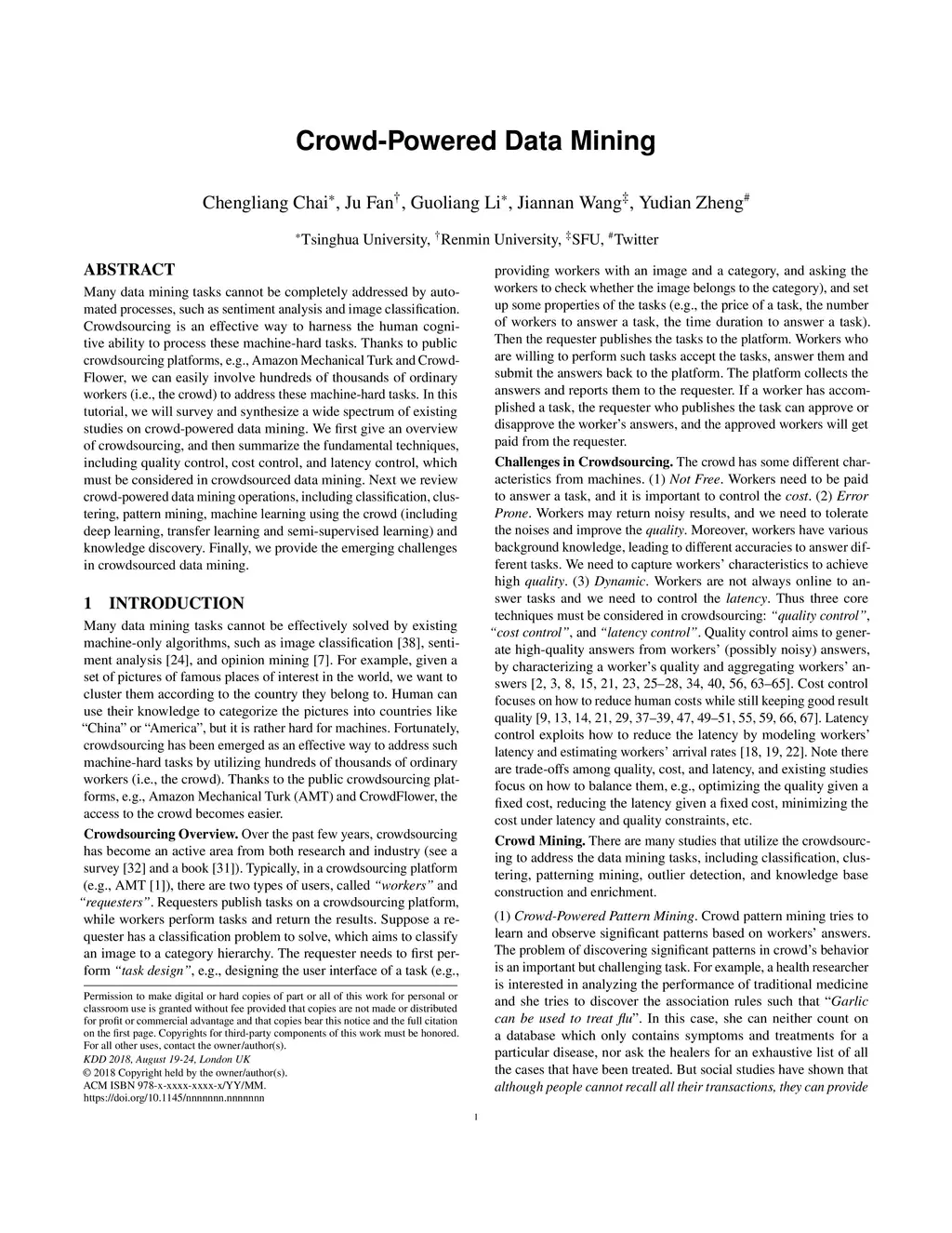 Many data mining tasks cannot be completely addressed by automated processes, such as sentiment analysis and image classification. Crowdsourcing is an effective way to harness the human cognitive ability to process these machine-hard tasks. Thanks to public crowdsourcing platforms, e.g., Amazon Mechanical Turk and CrowdFlower, we can easily involve hundreds of thousands of ordi- nary workers (i.e., the crowd) to address these machine-hard tasks. In this tutorial, we will survey and synthesize a wide spectrum of existing studies on crowd-powered data mining. We rst give an overview of crowdsourcing, and then summarize the fundamental techniques, including quality control, cost control, and latency control, which must be considered in crowdsourced data mining. Next we review crowd-powered data mining operations, including classification, clustering, pattern mining, outlier detection, knowledge base construction and enrichment. Finally, we provide the emerging challenges in crowdsourced data mining.