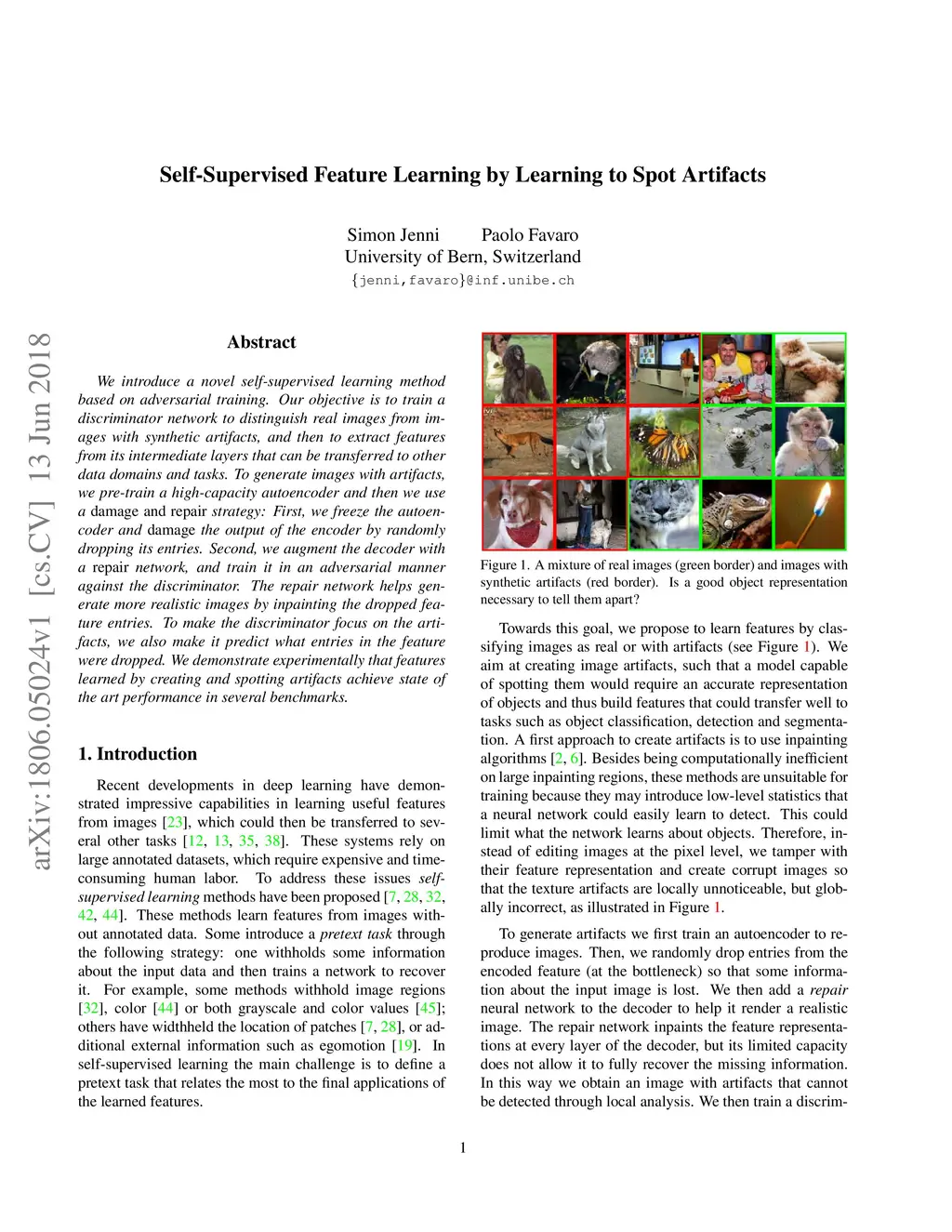 We introduce a novel self-supervised learning method based on adversarial training. Our objective is to train a discriminator network to distinguish real images from images with synthetic artifacts, and then to extract features from its intermediate layers that can be transferred to other data domains and tasks. To generate images with artifacts, we pre-train a high-capacity autoencoder and then we use a damage and repair strategy: First, we freeze the autoencoder and damage the output of the encoder by randomly dropping its entries. Second, we augment the decoder with a repair network, and train it in an adversarial manner against the discriminator. The repair network helps generate more realistic images by inpainting the dropped feature entries. To make the discriminator focus on the artifacts, we also make it predict what entries in the feature were dropped. We demonstrate experimentally that features learned by creating and spotting artifacts achieve state of the art performance in several benchmarks.