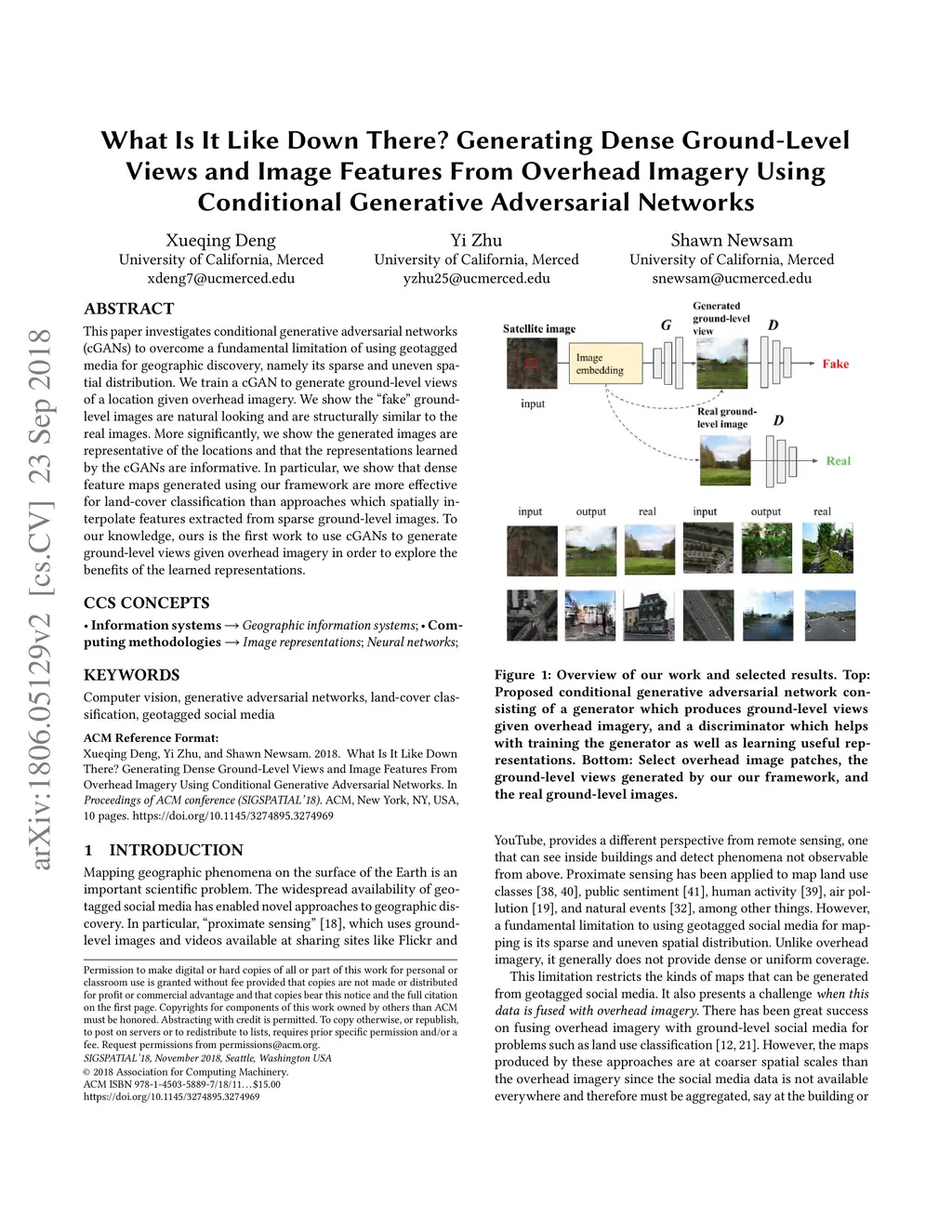 This paper investigates conditional generative adversarial networks (cGANs) to overcome a fundamental limitation of using geotagged media for geographic discovery, namely its sparse and uneven spatial distribution. We train a cGAN to generate ground-level views of a location given overhead imagery. We show the "fake" ground-level images are natural looking and are structurally similar to the real images. More significantly, we show the generated images are representative of the locations and that the representations learned by the cGANs are informative. In particular, we show that dense feature maps generated using our framework are more effective for land-cover classification than approaches which spatially interpolate features extracted from sparse ground-level images. To our knowledge, ours is the first work to use cGANs to generate ground-level views given overhead imagery and to explore the benefits of the learned representations.