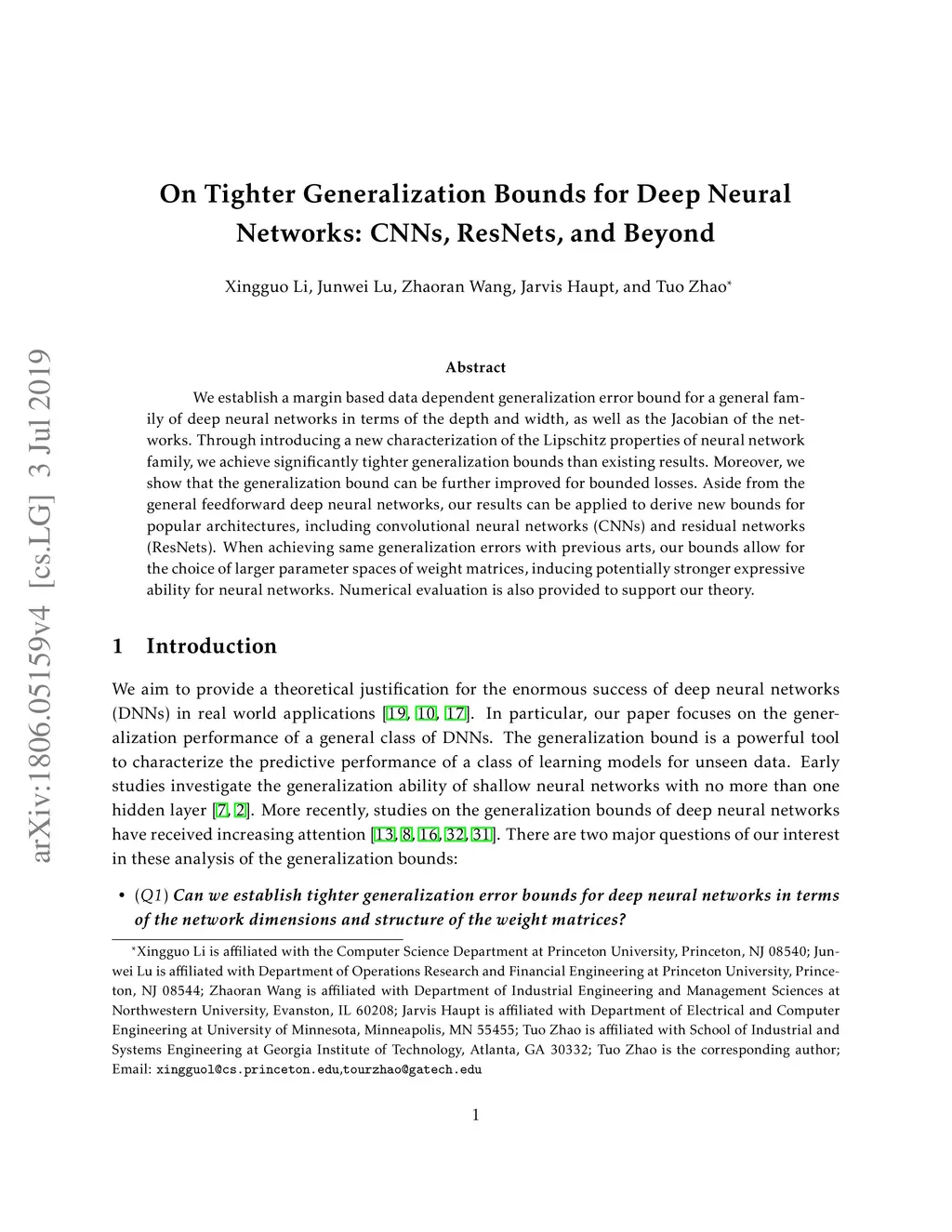 On Tighter Generalization Bound for Deep Neural Networks: CNNs, ResNets,