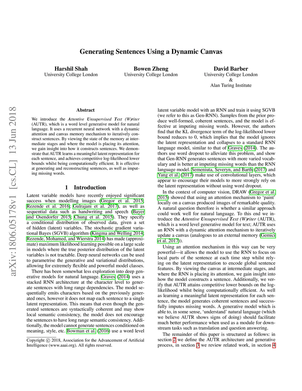 We introduce the Attentive Unsupervised Text (W)riter (AUTR), which is a word level generative model for natural language. It uses a recurrent neural network with a dynamic attention and canvas memory mechanism to iteratively construct sentences. By viewing the state of the memory at intermediate stages and where the model is placing its attention, we gain insight into how it constructs sentences. We demonstrate that AUTR learns a meaningful latent representation for each sentence, and achieves competitive log-likelihood lower bounds whilst being computationally efficient. It is effective at generating and reconstructing sentences, as well as imputing missing words.