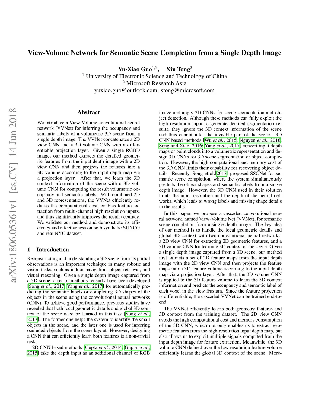 We introduce a View-Volume convolutional neural network (VVNet) for inferring the occupancy and semantic labels of a volumetric 3D scene from a single depth image. The VVNet concatenates a 2D view CNN and a 3D volume CNN with a differentiable projection layer. Given a single RGBD image, our method extracts the detailed geometric features from the input depth image with a 2D view CNN and then projects the features into a 3D volume according to the input depth map via a projection layer. After that, we learn the 3D context information of the scene with a 3D volume CNN for computing the result volumetric occupancy and semantic labels. With combined 2D and 3D representations, the VVNet efficiently reduces the computational cost, enables feature extraction from multi-channel high resolution inputs, and thus significantly improves the result accuracy. We validate our method and demonstrate its efficiency and effectiveness on both synthetic SUNCG and real NYU dataset.