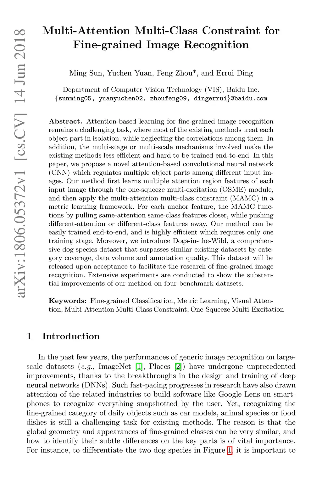 Attention-based learning for fine-grained image recognition remains a challenging task, where most of the existing methods treat each object part in isolation, while neglecting the correlations among them. In addition, the multi-stage or multi-scale mechanisms involved make the existing methods less efficient and hard to be trained end-to-end. In this paper, we propose a novel attention-based convolutional neural network (CNN) which regulates multiple object parts among different input images. Our method first learns multiple attention region features of each input image through the one-squeeze multi-excitation (OSME) module, and then apply the multi-attention multi-class constraint (MAMC) in a metric learning framework. For each anchor feature, the MAMC functions by pulling same-attention same-class features closer, while pushing different-attention or different-class features away. Our method can be easily trained end-to-end, and is highly efficient which requires only one training stage. Moreover, we introduce Dogs-in-the-Wild, a comprehensive dog species dataset that surpasses similar existing datasets by category coverage, data volume and annotation quality. This dataset will be released upon acceptance to facilitate the research of fine-grained image recognition. Extensive experiments are conducted to show the substantial improvements of our method on four benchmark datasets.