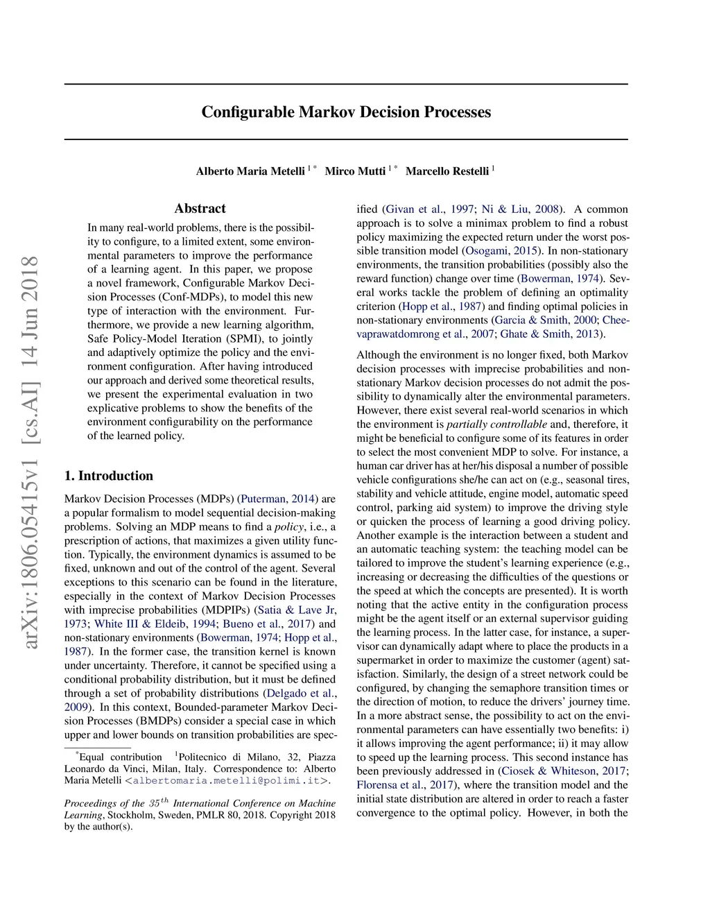In many real-world problems, there is the possibility to configure, to a limited extent, some environmental parameters to improve the performance of a learning agent. In this paper, we propose a novel framework, Configurable Markov Decision Processes (Conf-MDPs), to model this new type of interaction with the environment. Furthermore, we provide a new learning algorithm, Safe Policy-Model Iteration (SPMI), to jointly and adaptively optimize the policy and the environment configuration. After having introduced our approach and derived some theoretical results, we present the experimental evaluation in two explicative problems to show the benefits of the environment configurability on the performance of the learned policy.