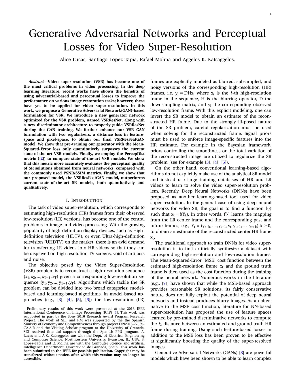 Video super-resolution (VSR) has become one of the most critical problems in video processing. In the deep learning literature, recent works have shown the benefits of using adversarial-based and perceptual losses to improve the performance on various image restoration tasks; however, these have yet to be applied for video super-resolution. In this work, we propose a Generative Adversarial Network(GAN)-based formulation for VSR. We introduce a new generator network optimized for the VSR problem, named VSRResNet, along with a new discriminator architecture to properly guide VSRResNet during the GAN training. We further enhance our VSR GAN formulation with two regularizers, a distance loss in feature-space and pixel-space, to obtain our final VSRResFeatGAN model. We show that pre-training our generator with the Mean-Squared-Error loss only quantitatively surpasses the current state-of-the-art VSR models. Finally, we employ the PercepDist metric (Zhang et al., 2018) to compare state-of-the-art VSR models. We show that this metric more accurately evaluates the perceptual quality of SR solutions obtained from neural networks, compared with the commonly used PSNR/SSIM metrics. Finally, we show that our proposed model, the VSRResFeatGAN model, outperforms current state-of-the-art SR models, both quantitatively and qualitatively.