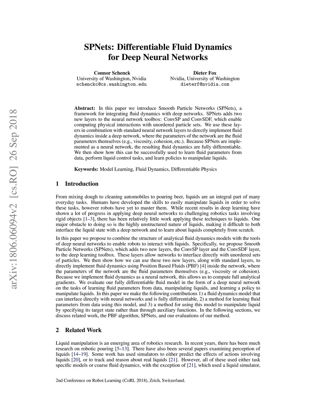 In this paper we introduce Smooth Particle Networks (SPNets), a framework for integrating fluid dynamics with deep networks. SPNets adds two new layers to the neural network toolbox: ConvSP and ConvSDF, which enable computing physical interactions with unordered particle sets. We use these lay- ers in combination with standard neural network layers to directly implement fluid dynamics inside a deep network, where the parameters of the network are the fluid parameters themselves (e.g., viscosity, cohesion, etc.). Because SPNets are imple- mented as a neural network, the resulting fluid dynamics are fully differentiable. We then show how this can be successfully used to learn fluid parameters from data, perform liquid control tasks, and learn policies to manipulate liquids.