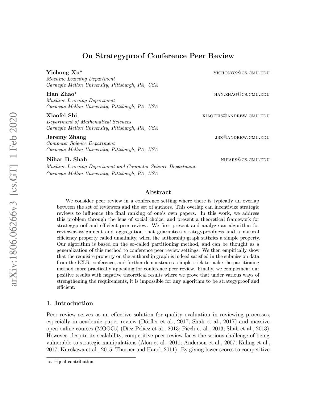 We consider peer review in a conference setting where there is typically an overlap between the set of reviewers and the set of authors. This overlap can incentivize strategic reviews to influence the final ranking of one's own papers. In this work, we address this problem through the lens of social choice, and present a theoretical framework for strategyproof and efficient peer review. We first present and analyze an algorithm for reviewer-assignment and aggregation that guarantees strategyproofness and a natural efficiency property called unanimity, when the authorship graph satisfies a simple property. Our algorithm is based on the so-called partitioning method, and can be thought as a generalization of this method to conference peer review settings. We then empirically show that the requisite property on the authorship graph is indeed satisfied in the submission data from the ICLR conference, and further demonstrate a simple trick to make the partitioning method more practically appealing for conference peer review. Finally, we complement our positive results with negative theoretical results where we prove that under various ways of strengthening the requirements, it is impossible for any algorithm to be strategyproof and efficient.