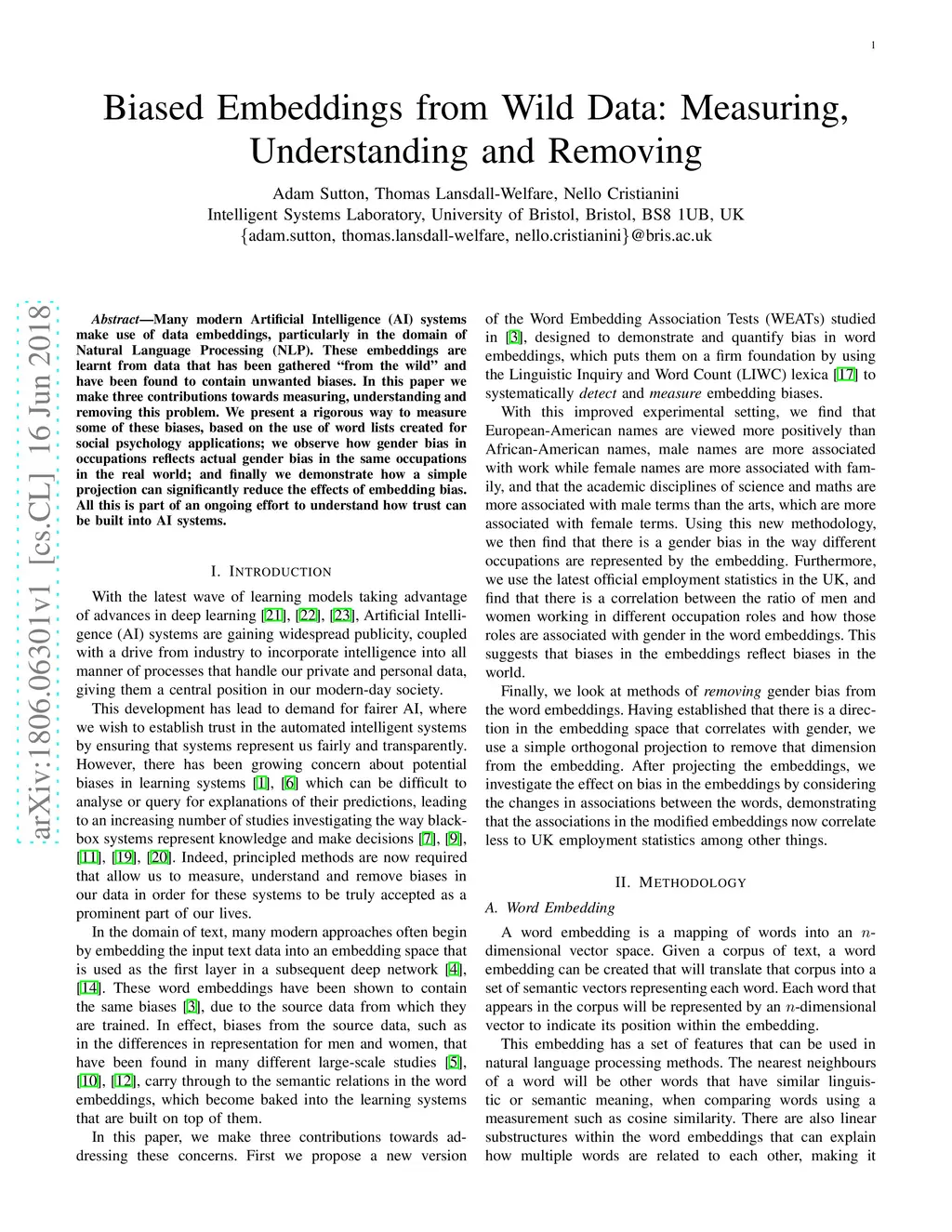 Many modern Artificial Intelligence (AI) systems make use of data embeddings, particularly in the domain of Natural Language Processing (NLP). These embeddings are learnt from data that has been gathered "from the wild" and have been found to contain unwanted biases. In this paper we make three contributions towards measuring, understanding and removing this problem. We present a rigorous way to measure some of these biases, based on the use of word lists created for social psychology applications; we observe how gender bias in occupations reflects actual gender bias in the same occupations in the real world; and finally we demonstrate how a simple projection can significantly reduce the effects of embedding bias. All this is part of an ongoing effort to understand how trust can be built into AI systems.