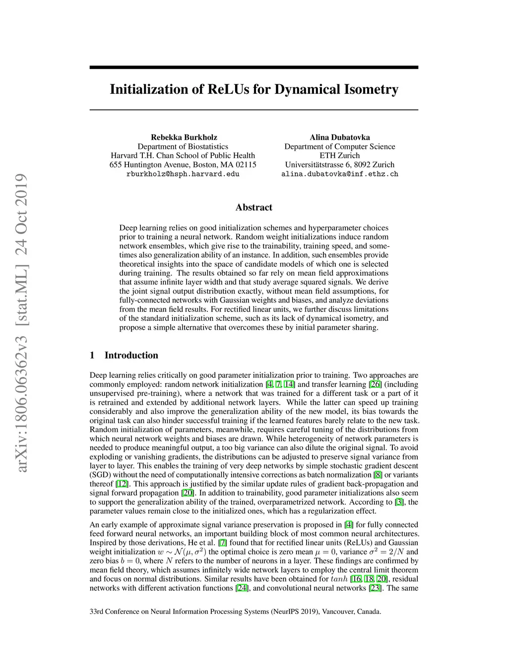 Deep learning relies on good initialization schemes and hyperparameter choices prior to training a neural network. Random weight initializations induce random network ensembles, which give rise to the trainability, training speed, and sometimes also generalization ability of an instance. In addition, such ensembles provide theoretical insights into the space of candidate models of which one is selected during training. The results obtained so far rely on mean field approximations that assume infinite layer width and that study average squared signals. We derive the joint signal output distribution exactly, without mean field assumptions, for fully-connected networks with Gaussian weights and biases, and analyze deviations from the mean field results. For rectified linear units, we further discuss limitations of the standard initialization scheme, such as its lack of dynamical isometry, and propose a simple alternative that overcomes these by initial parameter sharing.