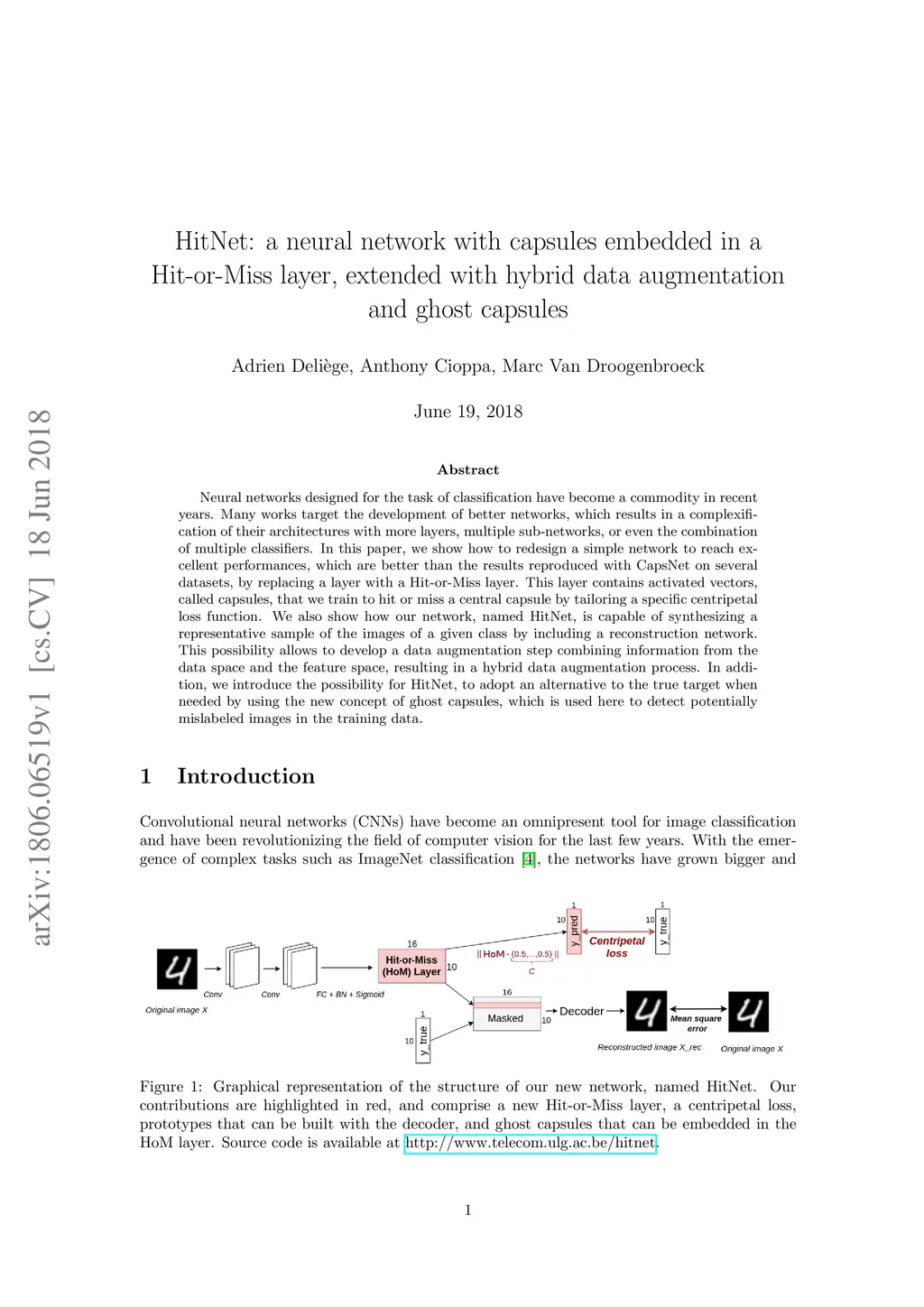Neural networks designed for the task of classification have become a commodity in recent years. Many works target the development of better networks, which results in a complexification of their architectures with more layers, multiple sub-networks, or even the combination of multiple classifiers. In this paper, we show how to redesign a simple network to reach excellent performances, which are better than the results reproduced with CapsNet on several datasets, by replacing a layer with a Hit-or-Miss layer. This layer contains activated vectors, called capsules, that we train to hit or miss a central capsule by tailoring a specific centripetal loss function. We also show how our network, named HitNet, is capable of synthesizing a representative sample of the images of a given class by including a reconstruction network. This possibility allows to develop a data augmentation step combining information from the data space and the feature space, resulting in a hybrid data augmentation process. In addition, we introduce the possibility for HitNet, to adopt an alternative to the true target when needed by using the new concept of ghost capsules, which is used here to detect potentially mislabeled images in the training data.