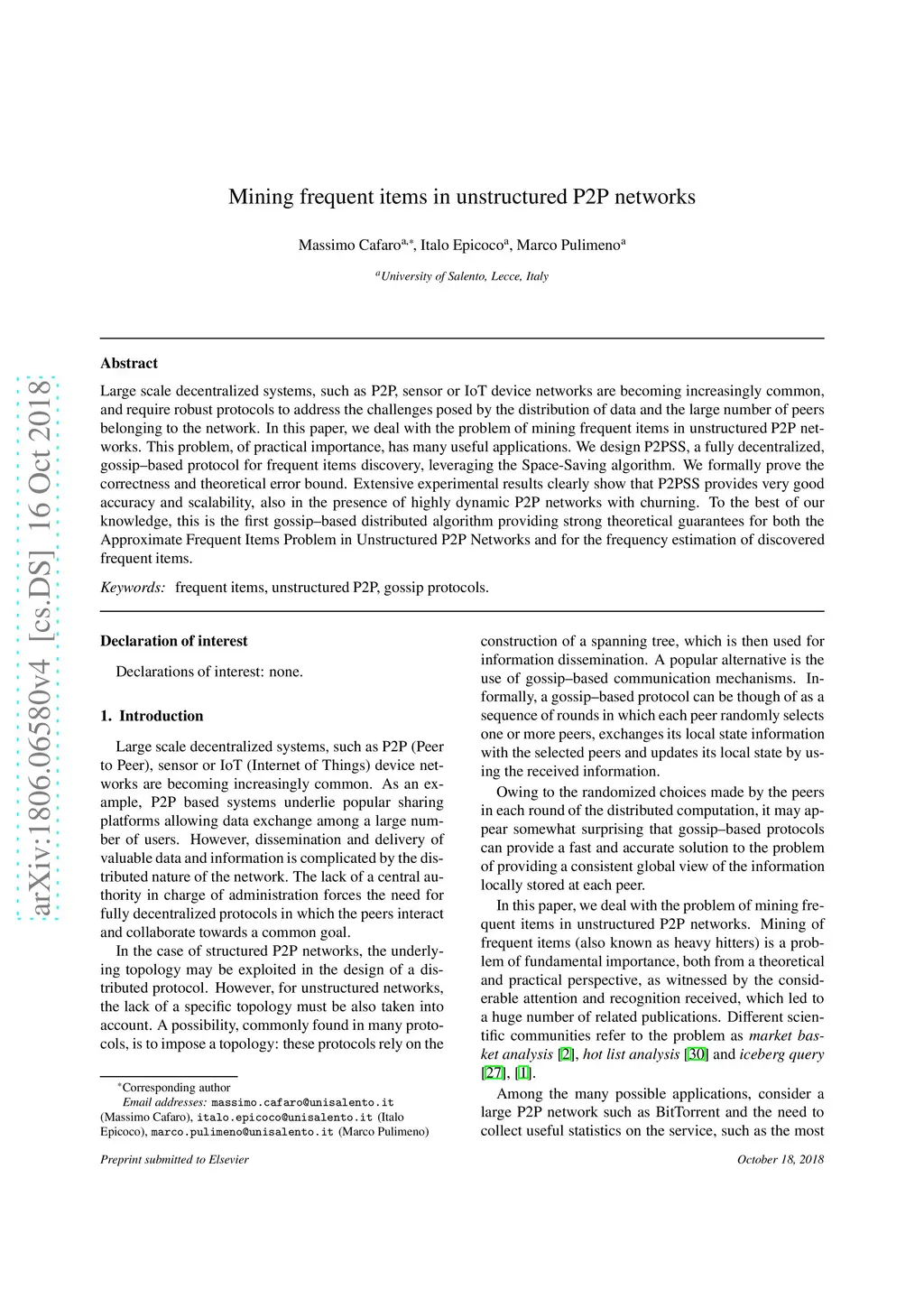 Large scale decentralized systems, such as P2P, sensor or IoT device networks are becoming increasingly common, and require robust protocols to address the challenges posed by the distribution of data and the large number of peers belonging to the network. In this paper, we deal with the problem of mining frequent items in unstructured P2P networks. This problem, of practical importance, has many useful applications. We design P2PSS, a fully decentralized, gossip--based protocol for frequent items discovery, leveraging the Space-Saving algorithm. We formally prove the correctness and theoretical error bound. Extensive experimental results clearly show that P2PSS provides very good accuracy and scalability, also in the presence of highly dynamic P2P networks with churning. To the best of our knowledge, this is the first gossip--based distributed algorithm providing strong theoretical guarantees for both the Approximate Frequent Items Problem in Unstructured P2P Networks and for the frequency estimation of discovered frequent items.