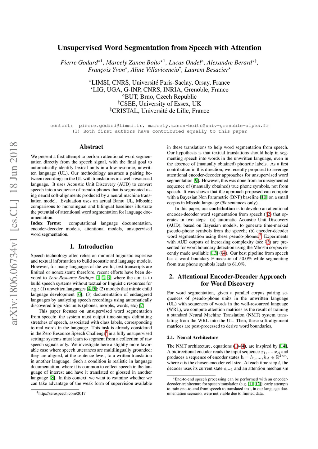 We present a first attempt to perform attentional word segmentation directly from the speech signal, with the final goal to automatically identify lexical units in a low-resource, unwritten language (UL). Our methodology assumes a pairing between recordings in the UL with translations in a well-resourced language. It uses Acoustic Unit Discovery (AUD) to convert speech into a sequence of pseudo-phones that is segmented using neural soft-alignments produced by a neural machine translation model. Evaluation uses an actual Bantu UL, Mboshi; comparisons to monolingual and bilingual baselines illustrate the potential of attentional word segmentation for language documentation.