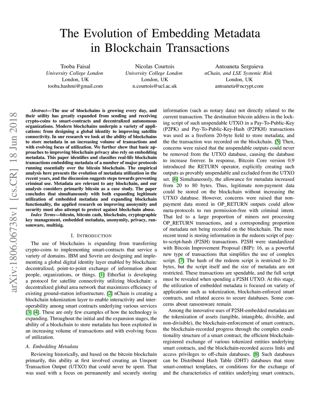 The use of blockchains is growing every day, and their utility has greatly expanded from sending and receiving crypto-coins to smart-contracts and decentralized autonomous organizations. Modern blockchains underpin a variety of applications: from designing a global identity to improving satellite connectivity. In our research we look at the ability of blockchains to store metadata in an increasing volume of transactions and with evolving focus of utilization. We further show that basic approaches to improving blockchain privacy also rely on embedding metadata. This paper identifies and classifies real-life blockchain transactions embedding metadata of a number of major protocols running essentially over the bitcoin blockchain. The empirical analysis here presents the evolution of metadata utilization in the recent years, and the discussion suggests steps towards preventing criminal use. Metadata are relevant to any blockchain, and our analysis considers primarily bitcoin as a case study. The paper concludes that simultaneously with both expanding legitimate utilization of embedded metadata and expanding blockchain functionality, the applied research on improving anonymity and security must also attempt to protect against blockchain abuse.