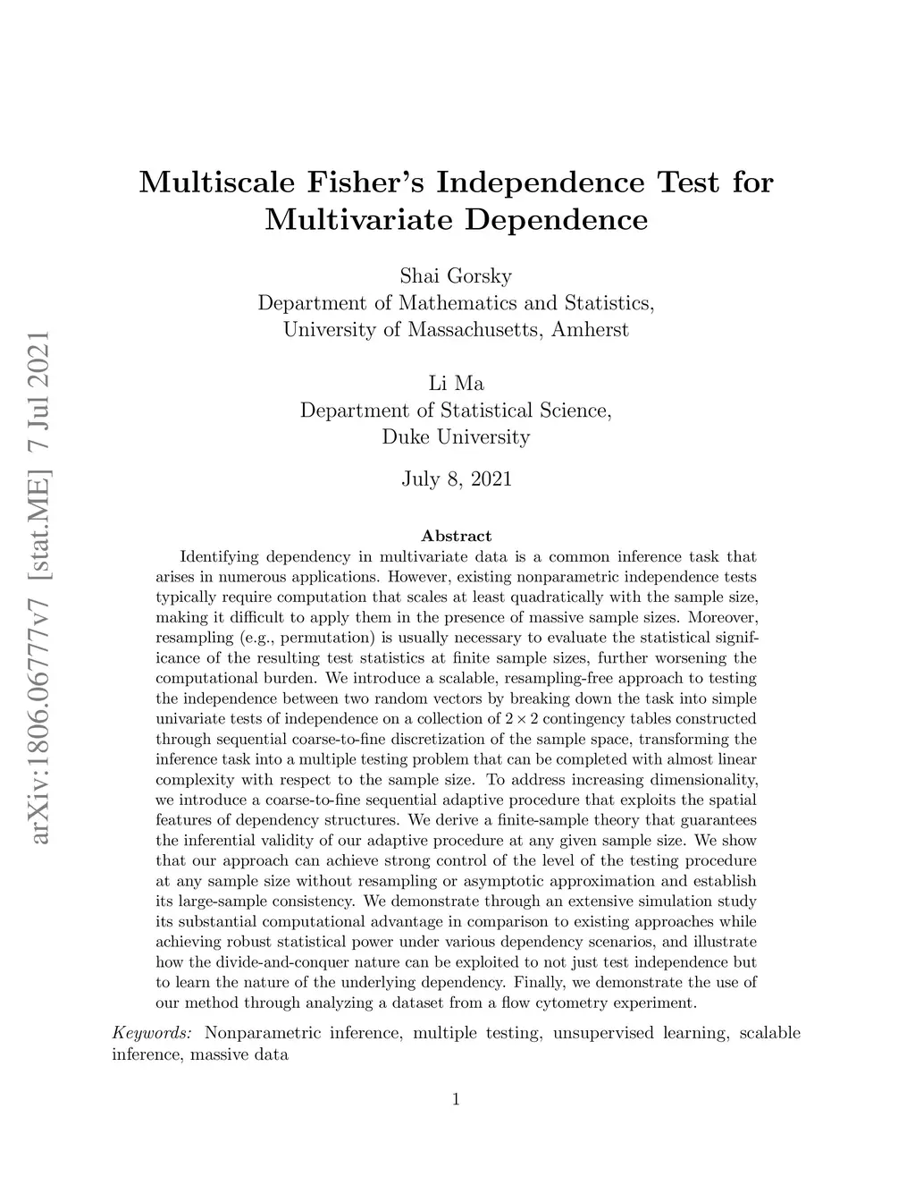 We present a framework for nonparametrically testing the independence between two random vectors that is scalable to massive data both computationally and statistically. We take a multi-scale divide-and-conquer strategy by breaking down the multivariate test into univariate tests of independence on a collection of 2x2 contingency tables, constructed by sequentially discretizing the sample space from coarse to fine scales. This strategy transforms a nonparametric testing problem that traditionally requires quadratic computational complexity with respect to sample size into one that scales almost linearly with the sample size. We further consider the scenario when the dimensionality of the random vectors grows large, in which case the curse of dimensionality demonstrates itself in our framework through an explosion in the number of univariate tests to be completed. To address this challenge we propose a data-adaptive coarse-to-fine testing procedure that completes a fraction of the univariate tests, which are judged to be prone to containing evidence for dependency by exploiting the spatial features of dependency structures. We provide a finite-sample theoretical guarantee for the exact validity of the adaptive procedure. In particular, we show that this procedure satisfies strong control of the family-wise error rate without any need for resampling or large-sample approximation, which existing approaches typically require. We demonstrate the substantial computational advantage of the procedure in comparison to existing approaches as well as its desirable statistical power under various dependency scenarios through an extensive simulation study. We illustrate through examples that our framework can be used not only for testing independence but for learning the nature of the underlying dependency. Finally, we demonstrate the use of our method through analyzing a data set from flowcytometry.