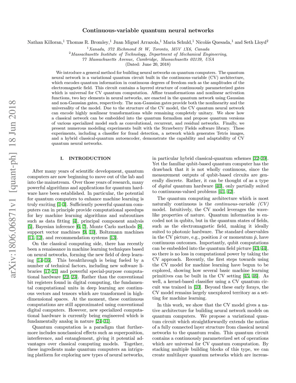 We introduce a general method for building neural networks on quantum computers. The quantum neural network is a variational quantum circuit built in the continuous-variable (CV) architecture, which encodes quantum information in continuous degrees of freedom such as the amplitudes of the electromagnetic field. This circuit contains a layered structure of continuously parameterized gates which is universal for CV quantum computation. Affine transformations and nonlinear activation functions, two key elements in neural networks, are enacted in the quantum network using Gaussian and non-Gaussian gates, respectively. The non-Gaussian gates provide both the nonlinearity and the universality of the model. Due to the structure of the CV model, the CV quantum neural network can encode highly nonlinear transformations while remaining completely unitary. We show how a classical network can be embedded into the quantum formalism and propose quantum versions of various specialized model such as convolutional, recurrent, and residual networks. Finally, we present numerous modeling experiments built with the Strawberry Fields software library. These experiments, including a classifier for fraud detection, a network which generates Tetris images, and a hybrid classical-quantum autoencoder, demonstrate the capability and adaptability of CV quantum neural networks.