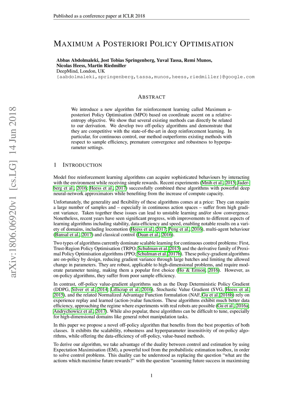 Maximum a Posteriori Policy Optimisation