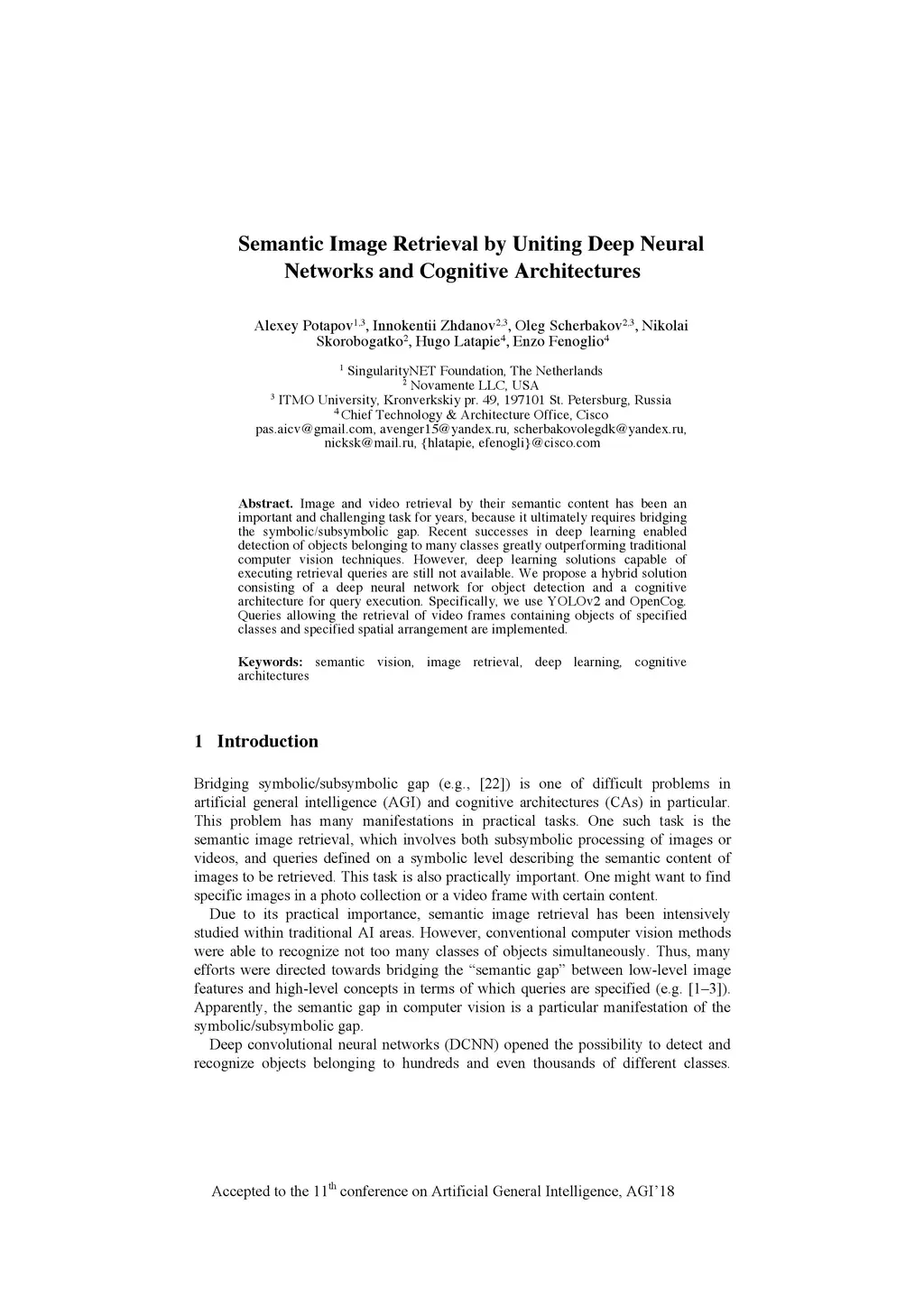 Image and video retrieval by their semantic content has been an important and challenging task for years, because it ultimately requires bridging the symbolic/subsymbolic gap. Recent successes in deep learning enabled detection of objects belonging to many classes greatly outperforming traditional computer vision techniques. However, deep learning solutions capable of executing retrieval queries are still not available. We propose a hybrid solution consisting of a deep neural network for object detection and a cognitive architecture for query execution. Specifically, we use YOLOv2 and OpenCog. Queries allowing the retrieval of video frames containing objects of specified classes and specified spatial arrangement are implemented.