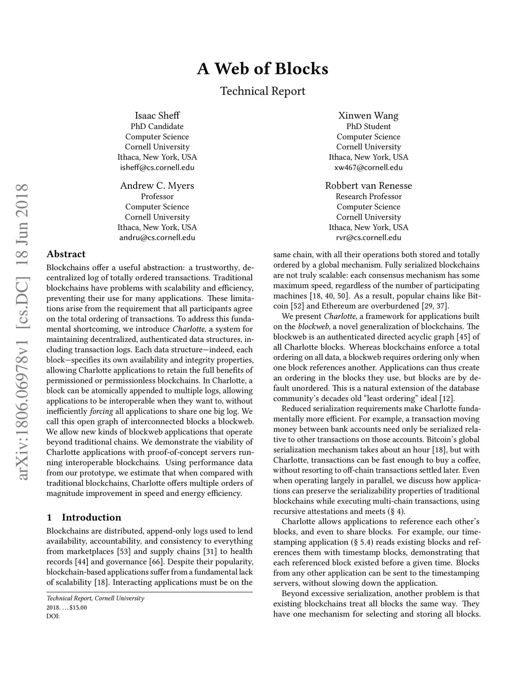 Blockchains offer a useful abstraction: a trustworthy, decentralized log of totally ordered transactions. Traditional blockchains have problems with scalability and efficiency, preventing their use for many applications. These limitations arise from the requirement that all participants agree on the total ordering of transactions. To address this fundamental shortcoming, we introduce Charlotte, a system for maintaining decentralized, authenticated data structures, including transaction logs. Each data structurestructure -- indeed, each block -- specifies its own availability and integrity properties, allowing Charlotte applications to retain the full benefits of permissioned or permissionless blockchains. In Charlotte, a block can be atomically appended to multiple logs, allowing applications to be interoperable when they want to, without inefficiently forcing all applications to share one big log. We call this open graph of interconnected blocks a blockweb. We allow new kinds of blockweb applications that operate beyond traditional chains. We demonstrate the viability of Charlotte applications with proof-of-concept servers running interoperable blockchains. Using performance data from our prototype, we estimate that when compared with traditional blockchains, Charlotte offers multiple orders of magnitude improvement in speed and energy efficiency.