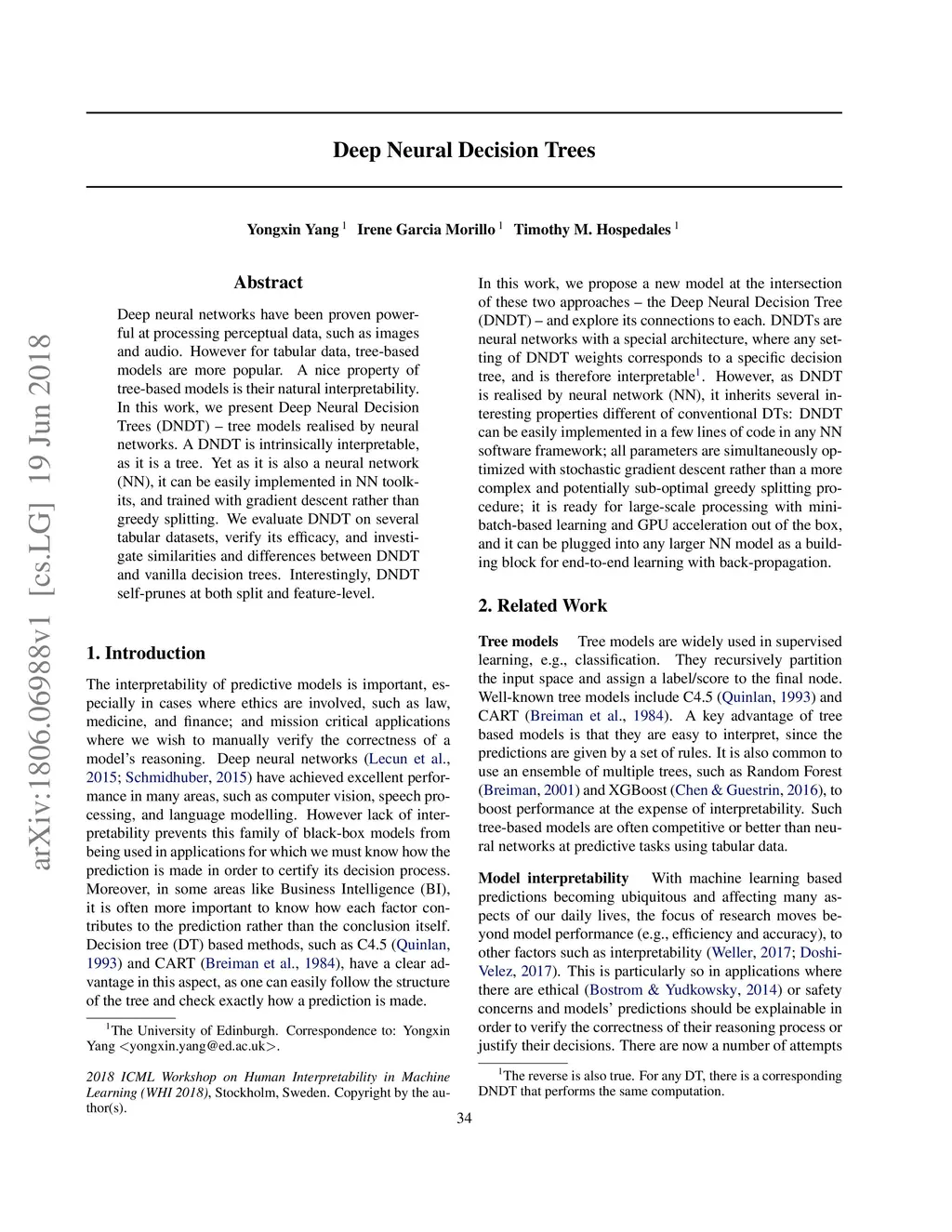 Deep neural networks have been proven powerful at processing perceptual data, such as images and audio. However for tabular data, tree-based models are more popular. A nice property of tree-based models is their natural interpretability. In this work, we present Deep Neural Decision Trees (DNDT) -- tree models realised by neural networks. A DNDT is intrinsically interpretable, as it is a tree. Yet as it is also a neural network (NN), it can be easily implemented in NN toolkits, and trained with gradient descent rather than greedy splitting. We evaluate DNDT on several tabular datasets, verify its efficacy, and investigate similarities and differences between DNDT and vanilla decision trees. Interestingly, DNDT self-prunes at both split and feature-level.