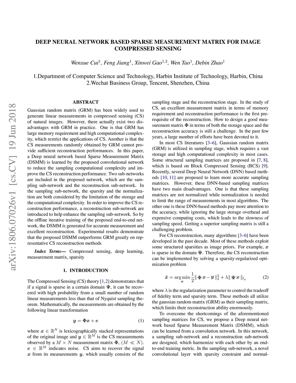 Gaussian random matrix (GRM) has been widely used to generate linear measurements in compressed sensing (CS) of natural images. However, there actually exist two disadvantages with GRM in practice. One is that GRM has large memory requirement and high computational complexity, which restrict the applications of CS. Another is that the CS measurements randomly obtained by GRM cannot provide sufficient reconstruction performances. In this paper, a Deep neural network based Sparse Measurement Matrix (DSMM) is learned by the proposed convolutional network to reduce the sampling computational complexity and improve the CS reconstruction performance. Two sub networks are included in the proposed network, which are the sampling sub-network and the reconstruction sub-network. In the sampling sub-network, the sparsity and the normalization are both considered by the limitation of the storage and the computational complexity. In order to improve the CS reconstruction performance, a reconstruction sub-network are introduced to help enhance the sampling sub-network. So by the offline iterative training of the proposed end-to-end network, the DSMM is generated for accurate measurement and excellent reconstruction. Experimental results demonstrate that the proposed DSMM outperforms GRM greatly on representative CS reconstruction methods